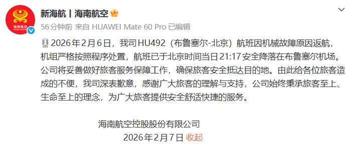 海南航空控股股份有限公司(简称“海南航空”)2月7日发文称,2月6日,公司HU492(布鲁塞尔—北京)航班因机械故障原因返航,机组严格按照程序处置,航班已于北京时间当日21:17安全降落在布鲁塞尔机场。公司将妥善做好旅客服务保障工作,确保旅客安全抵达目的地。由此给各位旅客造成的不便,公司深表歉意。