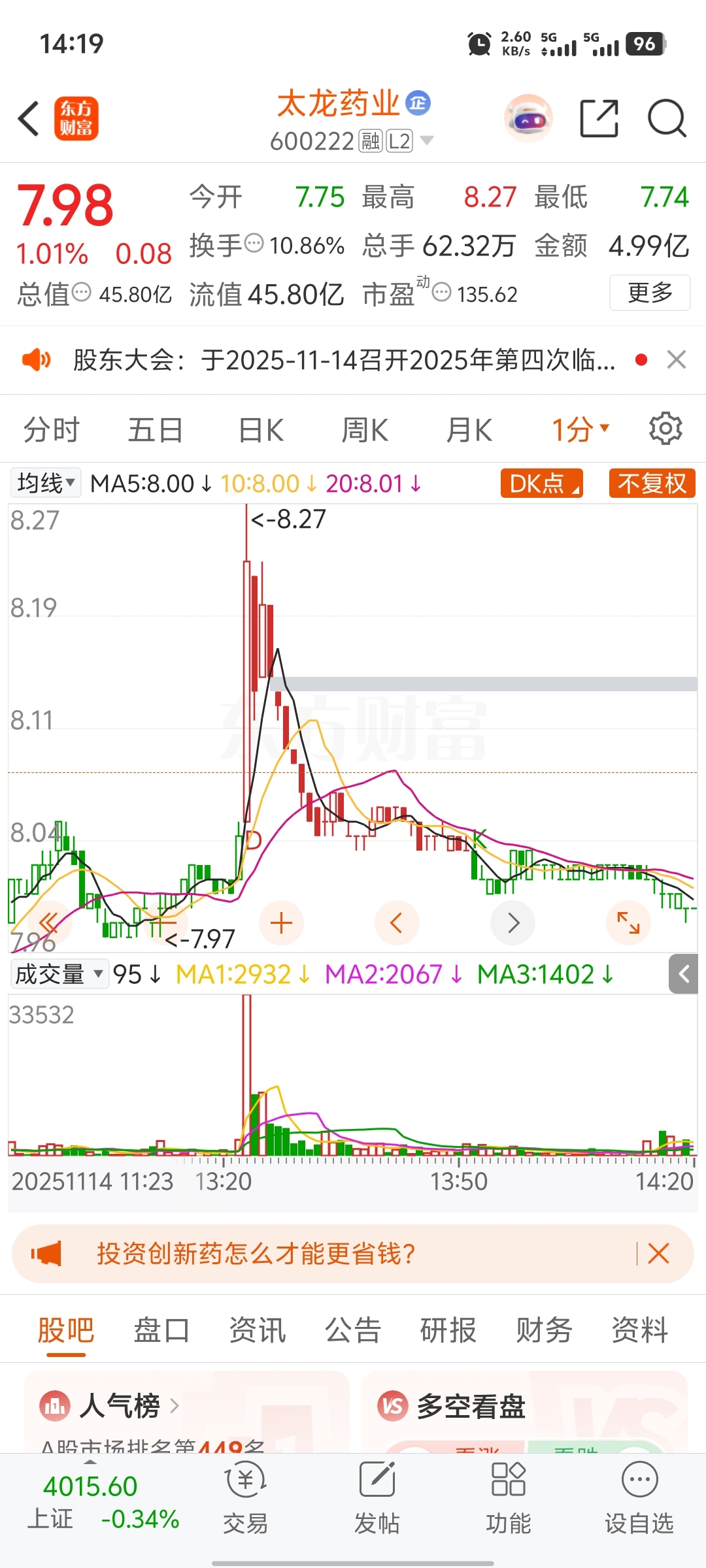 $太龙药业(SH600222)$ 三分钟才三分钟疲软无力