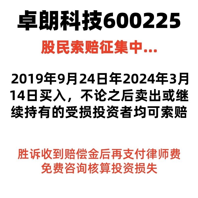 $退市卓朗(SH600225)$ 2019年09月24日至2024年03月14日(含)期间有买入且在2024年03月14日后卖出或继续持有的受损投资者可留言@索赔倒计时
