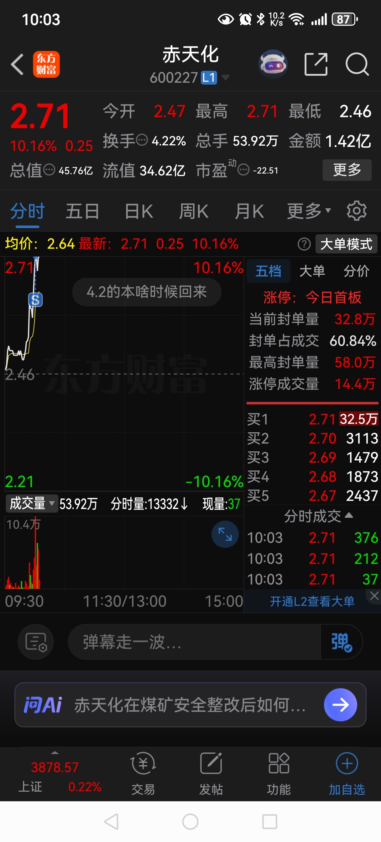 $赤天化(SH600227)$ 2.51入的,把1%的仓位挂涨停做T,今天出来1%,只有这样来降低成本了