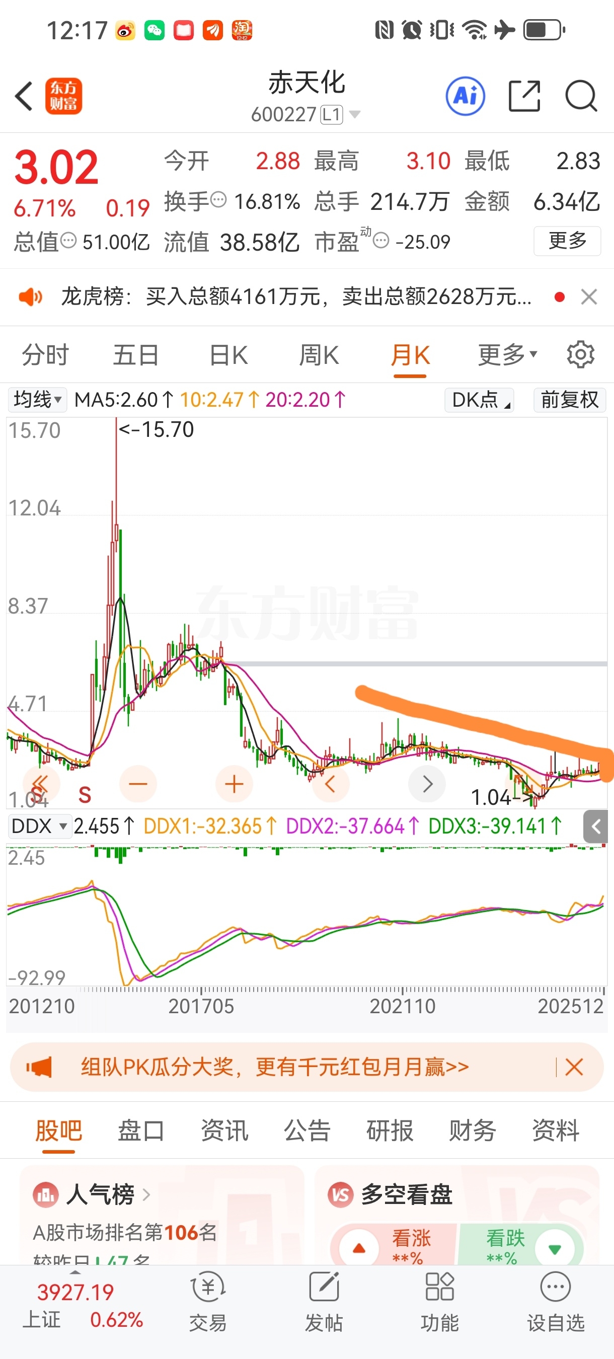 $赤天化(SH600227)$ 如果收盘3.11就是突破了从4.55到3.17的下降压力线。后面是不是一绝骑尘。
