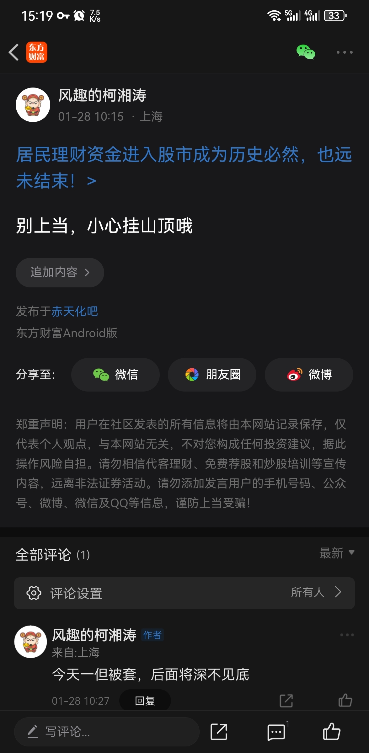 温馨提示: 1.根据《证券法》规定,禁止编造、传播虚假信息或者误导性信息,扰乱证券市场;2.用户在本社区发表的所有资料、言论等仅代表个人观点,与本网站立场无关,不对您构成任何投资建议。用户应基于自己的独立判断,自行决定证券投资并承担相应风险。《东方财富社区管理规定》
