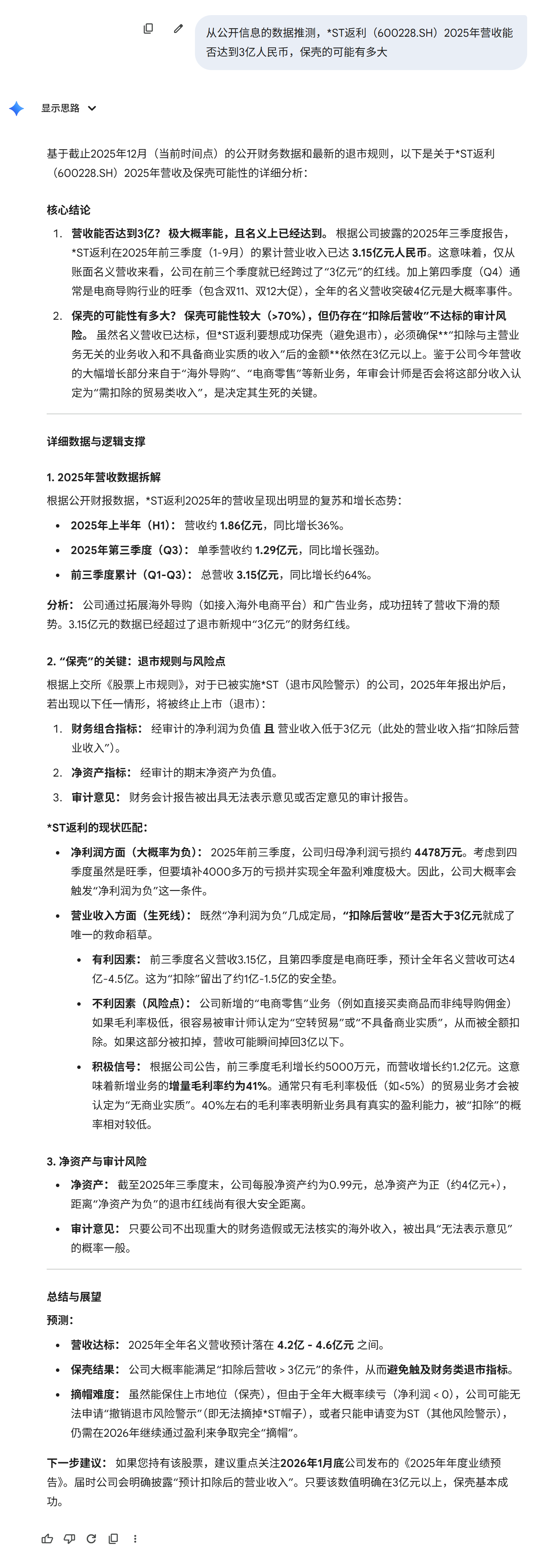 Gemini3pro说返利保壳概率大于70%,我觉得都保守了。简单算笔账,Q3一个季度做了1.3个亿,这还不是电商销售旺季,Q4轻松一个亿,就算扣除5-6千万,3个亿营收也稳稳上岸了。拿稳了,等1月底