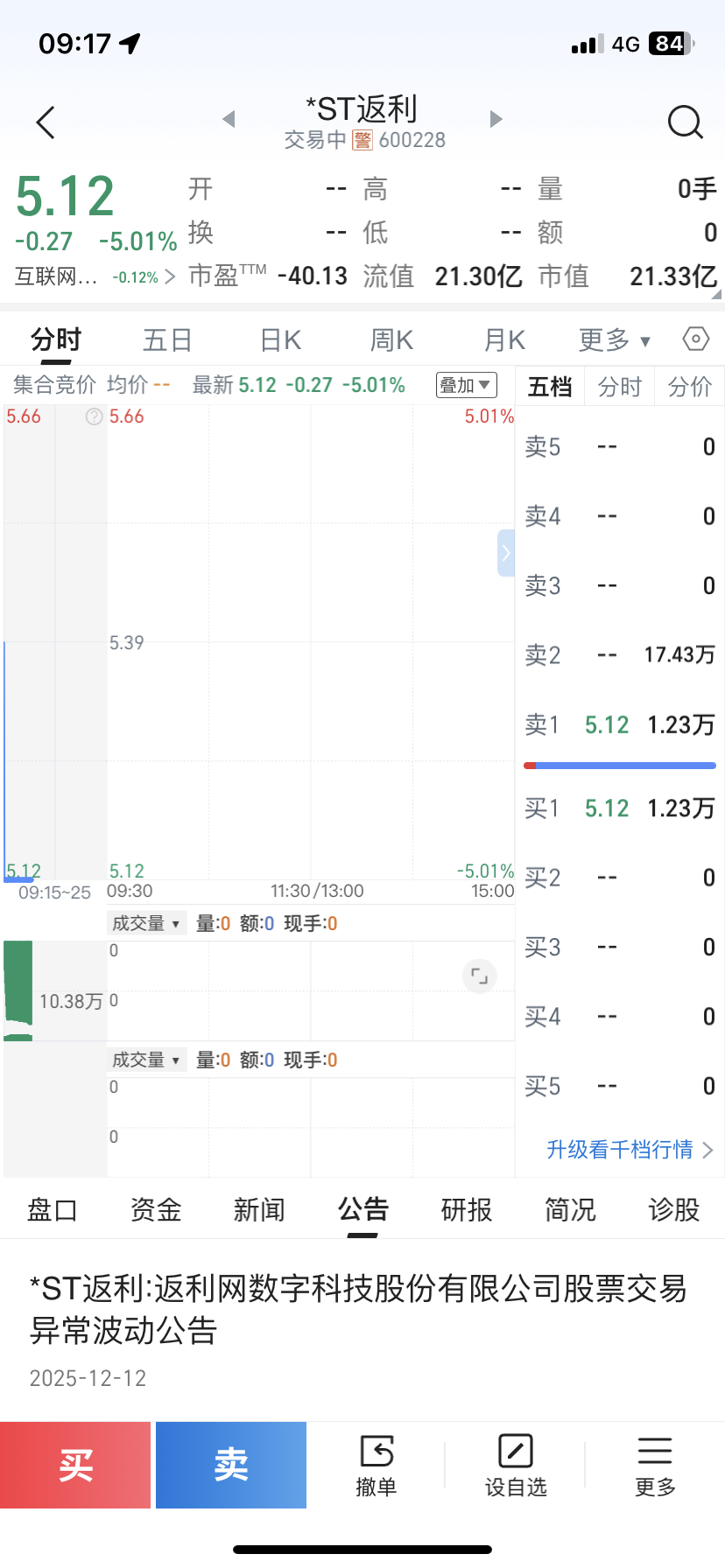 $*ST返利(SH600228)$ 早上主力挂了1.2万,其余的都是散户隔夜饭