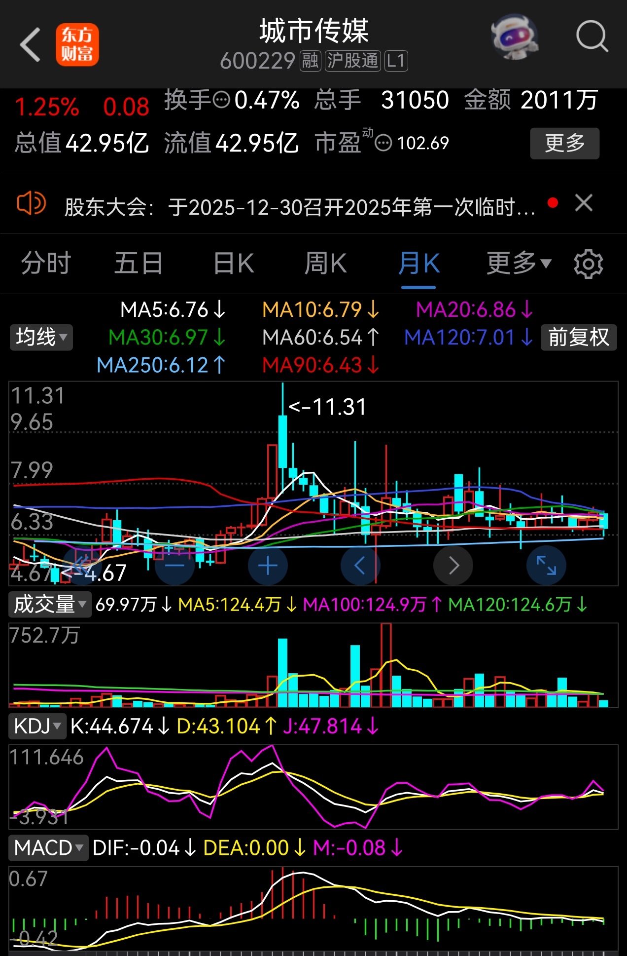 $城市传媒(SH600229)$ 城市传媒月线级别来看,股价在多条均线形成的均线带里震荡运行,而均线带越来越收缩,形成收缩三角形,MACD指标的黄白线粘出于粘合期,少则一两个月,多则三五个月,城市传媒将迎来一波较大的变盘行情。