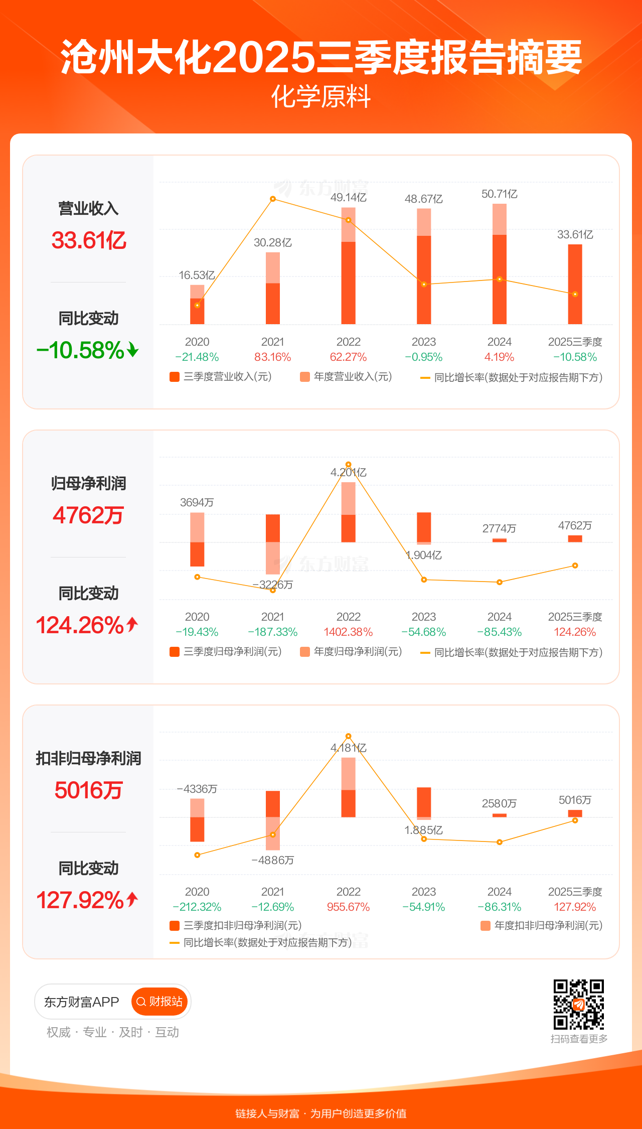沧州大化10月31日发布2025年三季报显示,公司前三季实现营业收入33.61亿元,同比下滑10.58%;归母净利润4762.31万元,同比增长124.26%;扣非归母净利润5016.47万元,同比增长127.92%。
