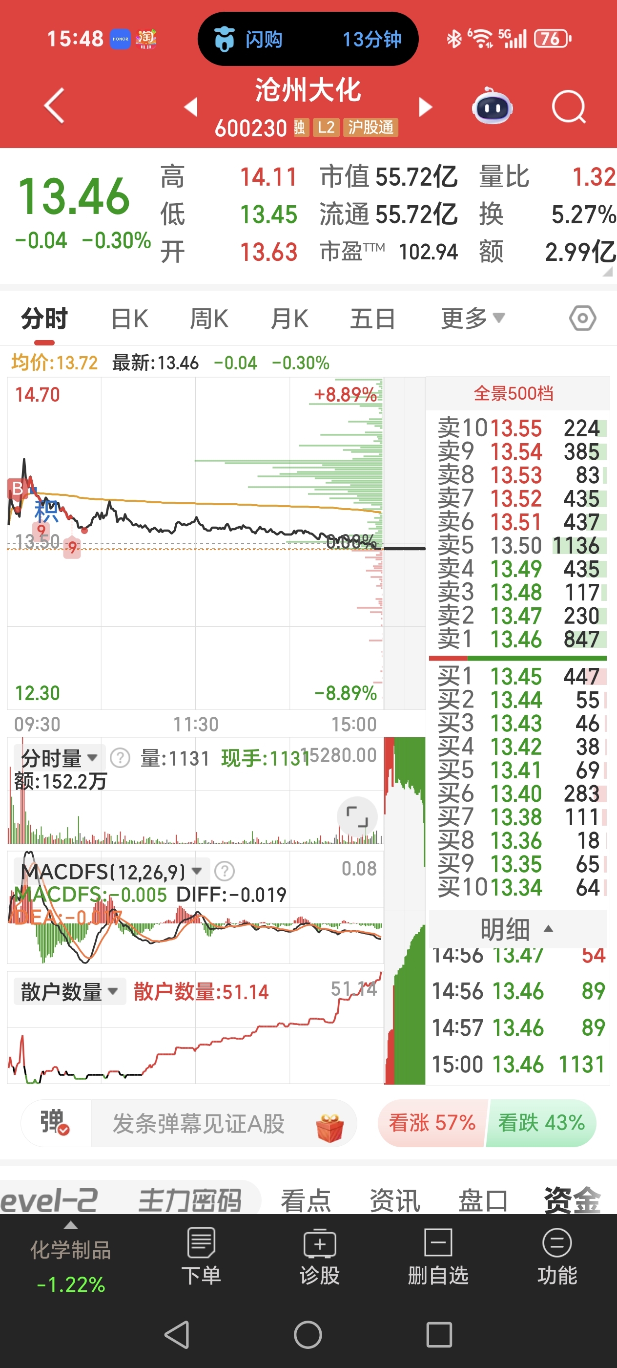 $沧州大化(SH600230)$ 今天上午买了两笔,收盘正好打到自己成本线附近。今天上影线确实有点长,但是说出货我是不敢苟同,打开30,60分时线,就全天这量哪个分时也没再次放量。但是不是说下周不会继续调整,个人认为今天的高点不是阶段顶。本身买入的逻辑是看全球前三大厂mdi部分设备需要停产检修,还有就是年底可能和鲁西整合部分生产业务,暂时还是先持有观望