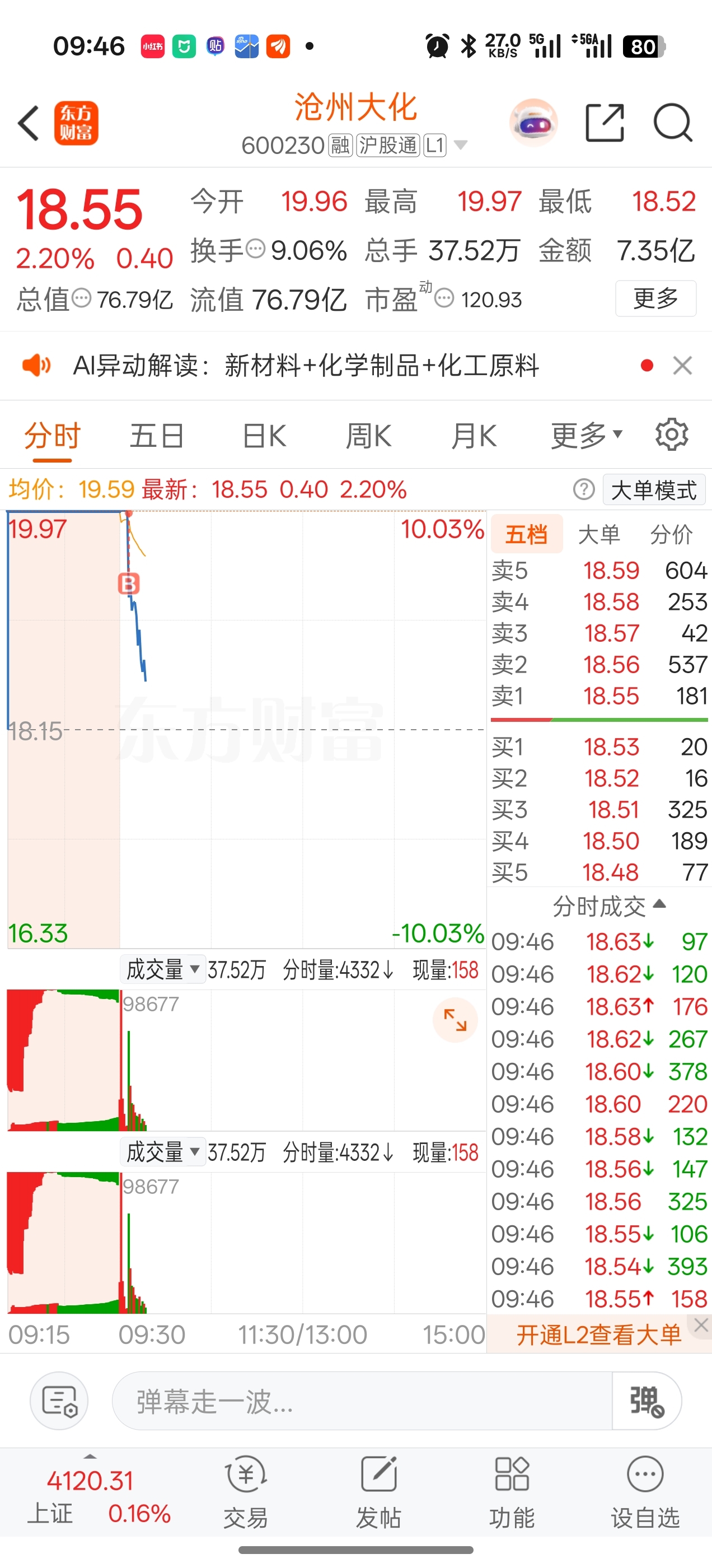$沧州大化(SH600230)$ 终于排进去了,下午回封。起步5个涨停