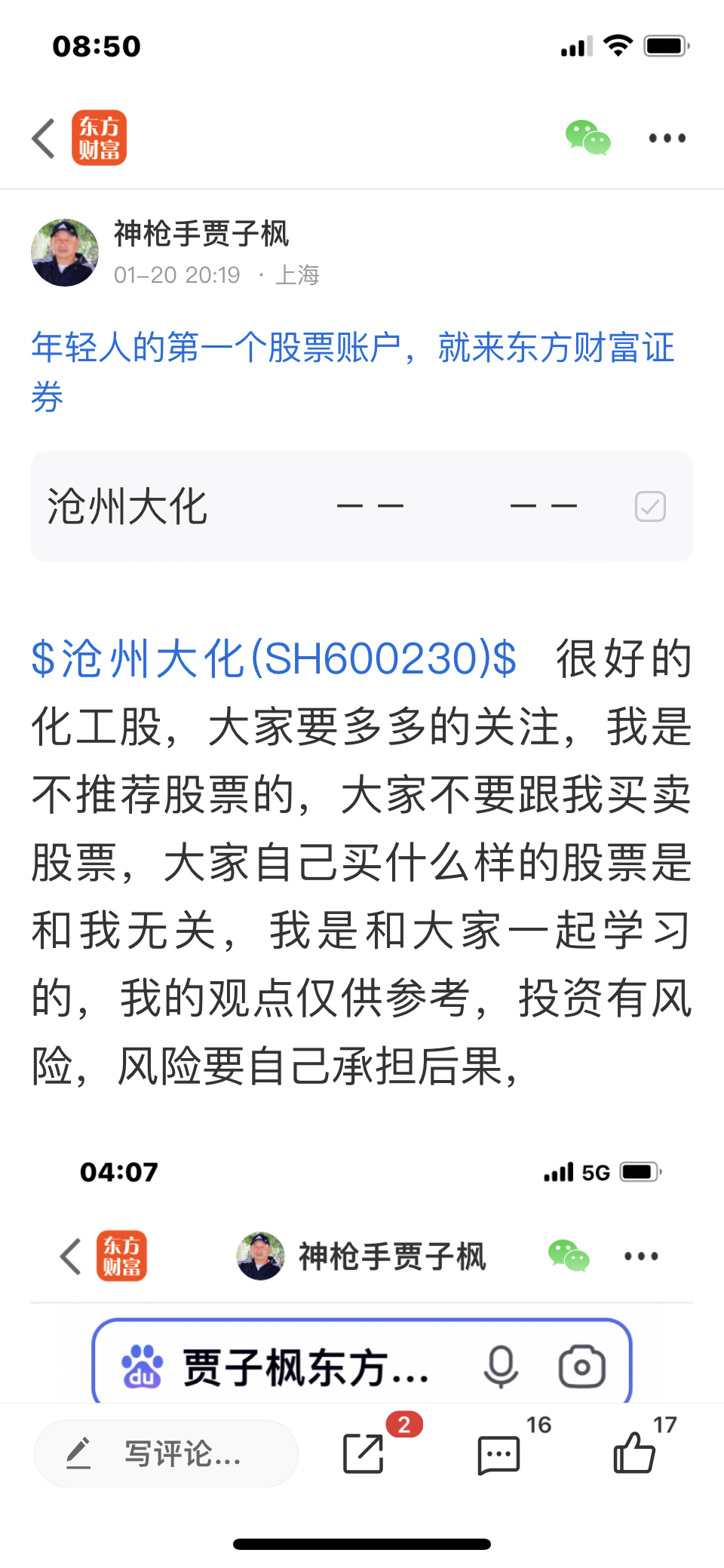$沧州大化(SH600230)$ 这个股是我一月二十号发表看涨的股票,大家不要追高买入,必须要做好高抛低吸,我是不推荐股票,大家不要跟我买卖股票,大家自己买什么样的股票是和我无关的,因为我是免费和大家一起交流股票,我是和大家一起学习的,我的观点仅供参考,不构成任何投资建议,投资有风险,风险要自己承担后果,