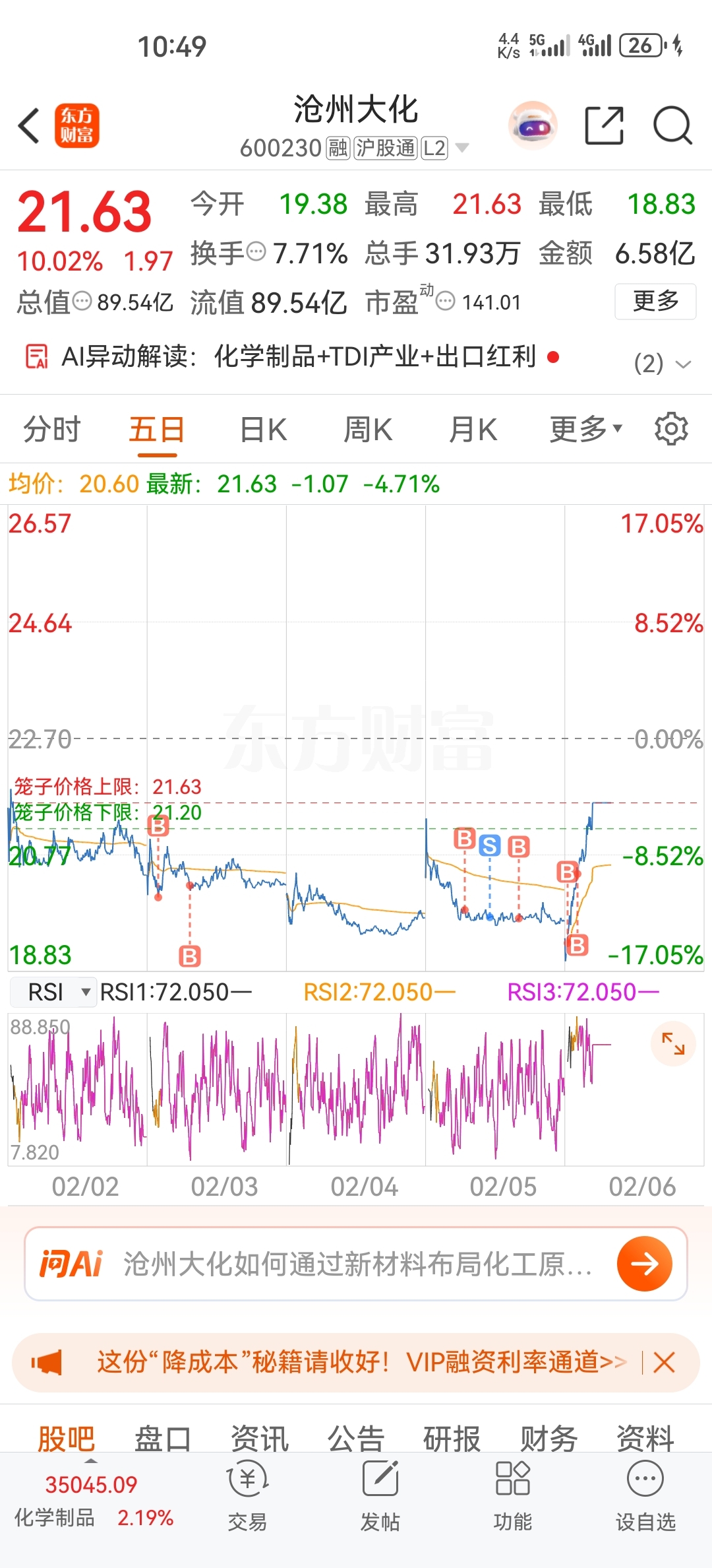 $沧州大化(SH600230)$ 昨天买点成卖不小心卖了三分之二 不然就回本了