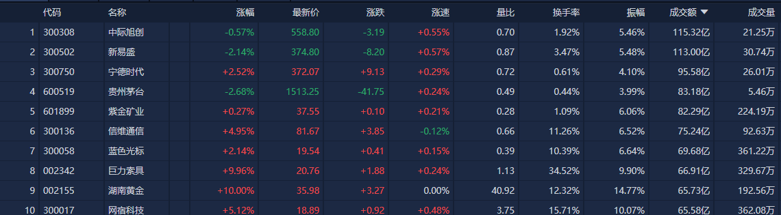 个股方面,中际旭创成交额超115亿元居首,新易盛成交额113亿元,宁德时代、贵州茅台、紫金矿业、信维通信等成交额靠前。