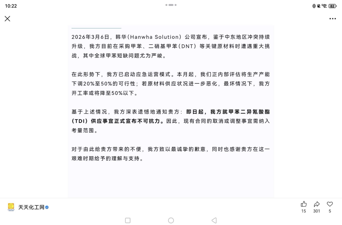 $沧州大化(SH600230)$ 韩华TDI不可抗力