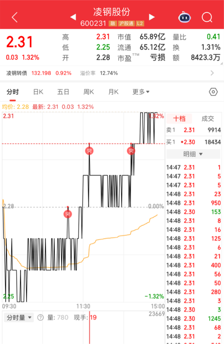 $凌钢股份(SH600231)$ 今天尾盘梭哈这个了,明天能吃一口蚊子肉就跑,破2.24就割