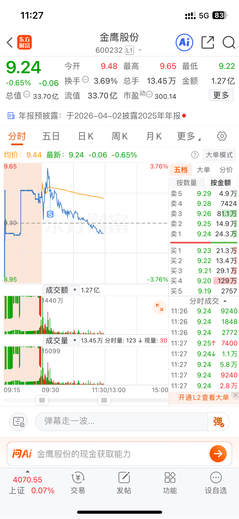 $金鹰股份(SH600232)$ 赚了3个多点跑了,拉高典型的出货