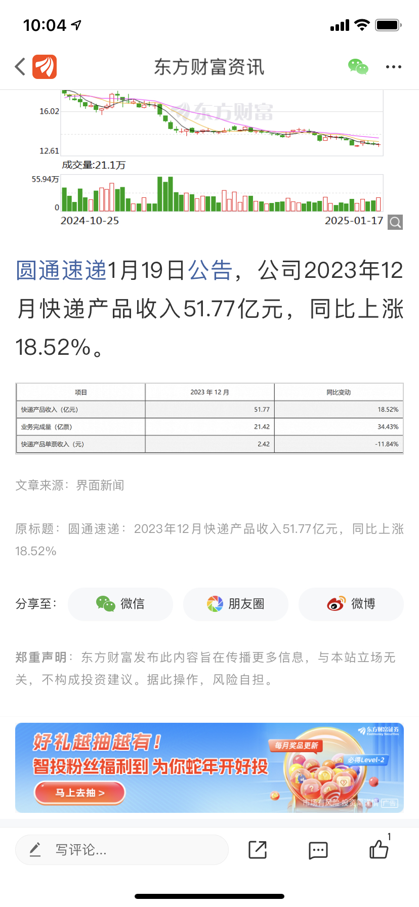 $圆通速递(SH600233)$ 去年4季度的利润10.58亿,今年的业绩有人预测10亿,有人预测15亿究竟是多少呢?