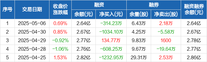 圆通速递:融资净偿还314.23万元,融资余额2.64亿元(05-06)