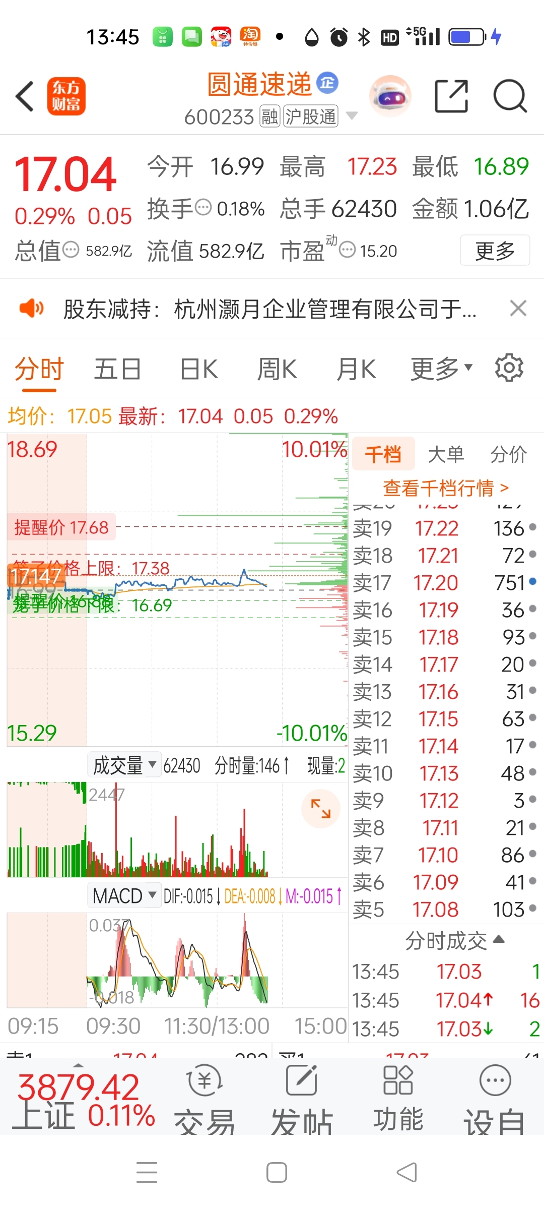 结合大盘走势 下周一大概率是要高开的 。圆通下周一有望冲高5~7个点 。个人观点 不代表投资建议。