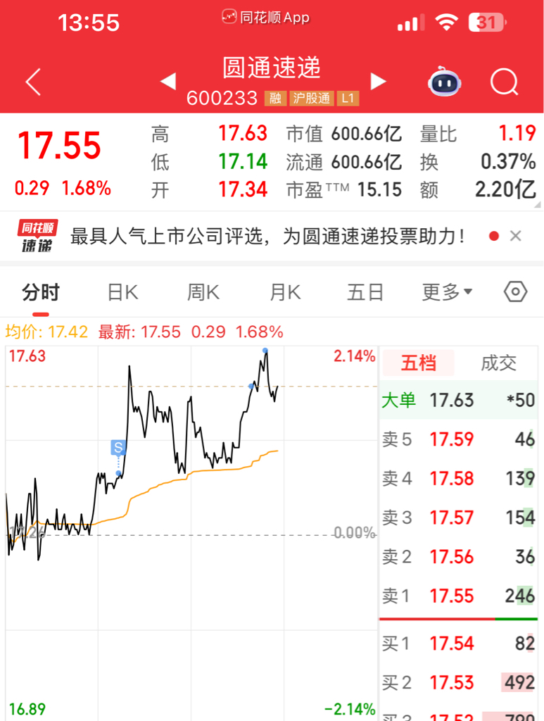 $圆通速递(SH600233)$ 卖卖卖,差不多卖完了,你可以涨了。