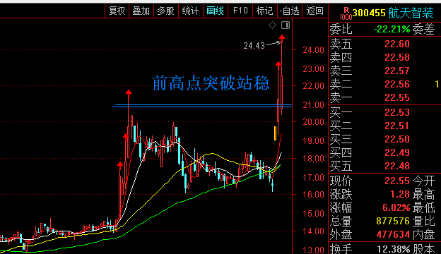 航天智装 今天走势符合预期,竞价低开,但是开盘迅速上涨,沿着分时线直接爬升,全天收长上影,收盘上涨6个点。今天这支票欧阳没有进,主要是板块内个股走势略显单薄,没有群体确定性行情。不过从位置上看,今天之后机会反而更饱满一些,需要明日持续关注。