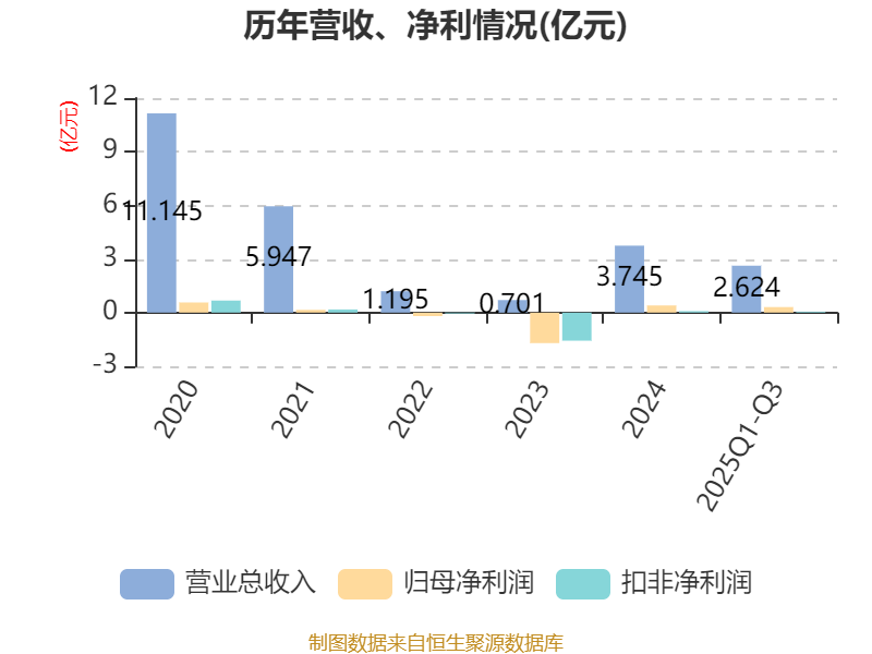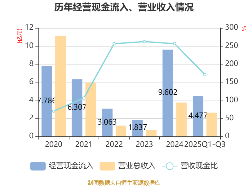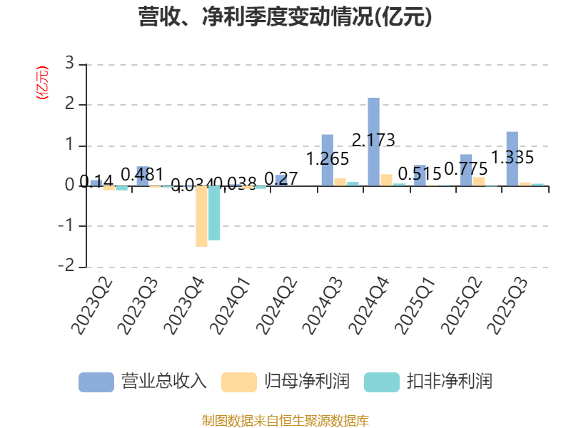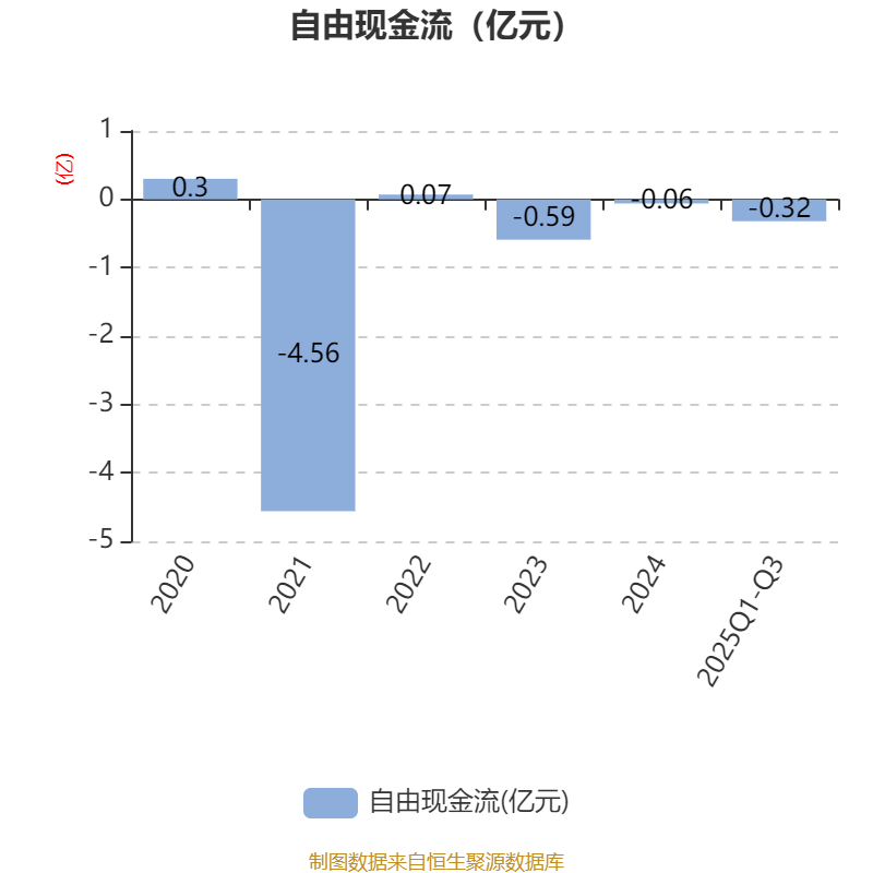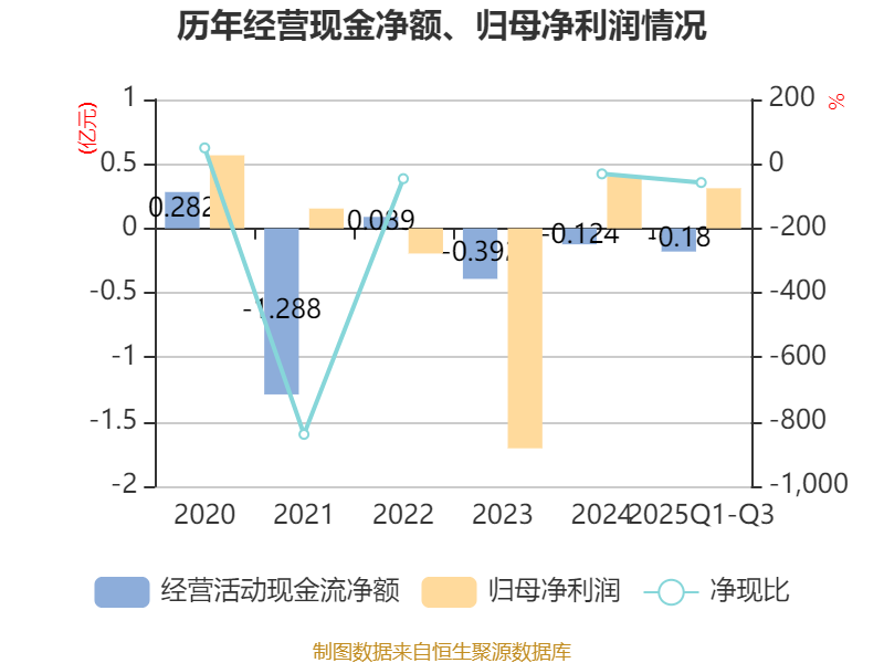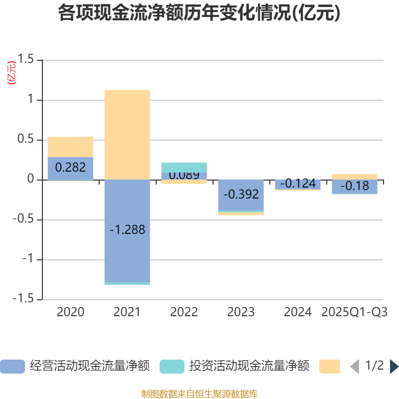 2025年前三季度,公司经营活动现金流净额为-1796.51万元,同比减少715.46万元;筹资活动现金流净额686.19万元,同比增加753.5万元;投资活动现金流净额-36.8万元,上年同期为-175.74万元。