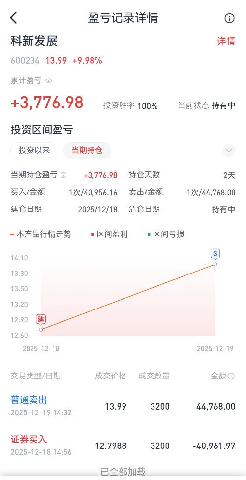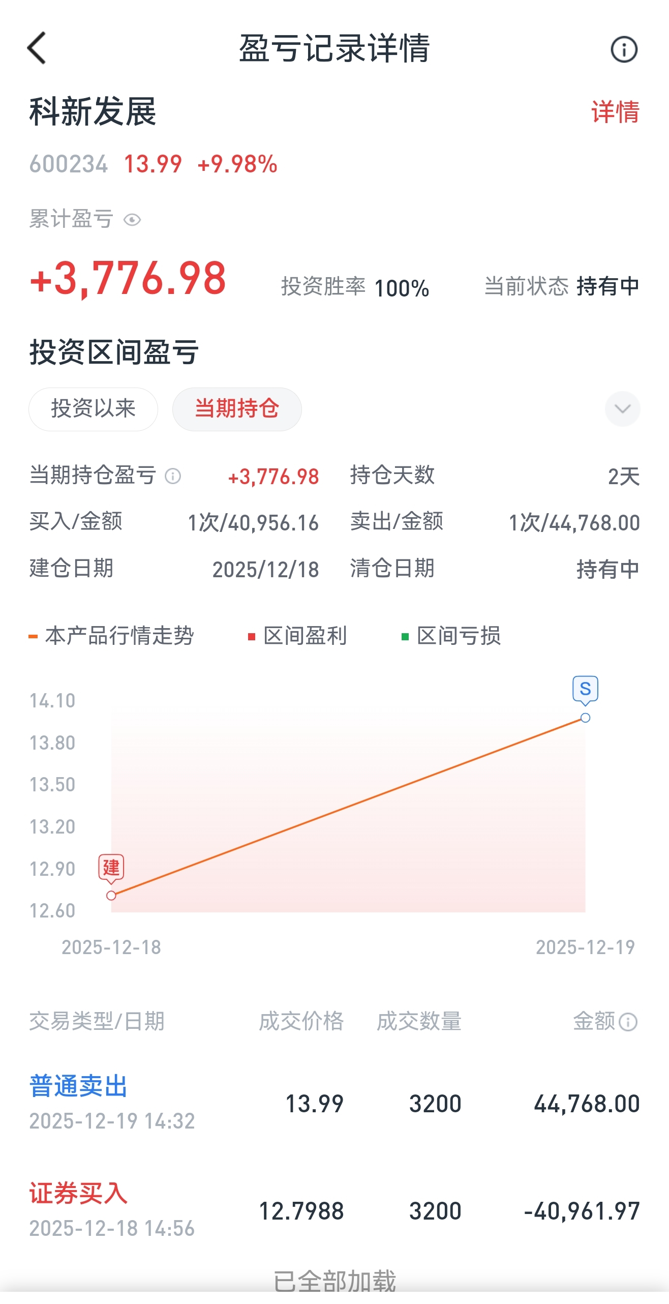 我撤了,昨天收市前12.79进的,今天13.99出了,买双鞋去。$科新发展(SH600234)$