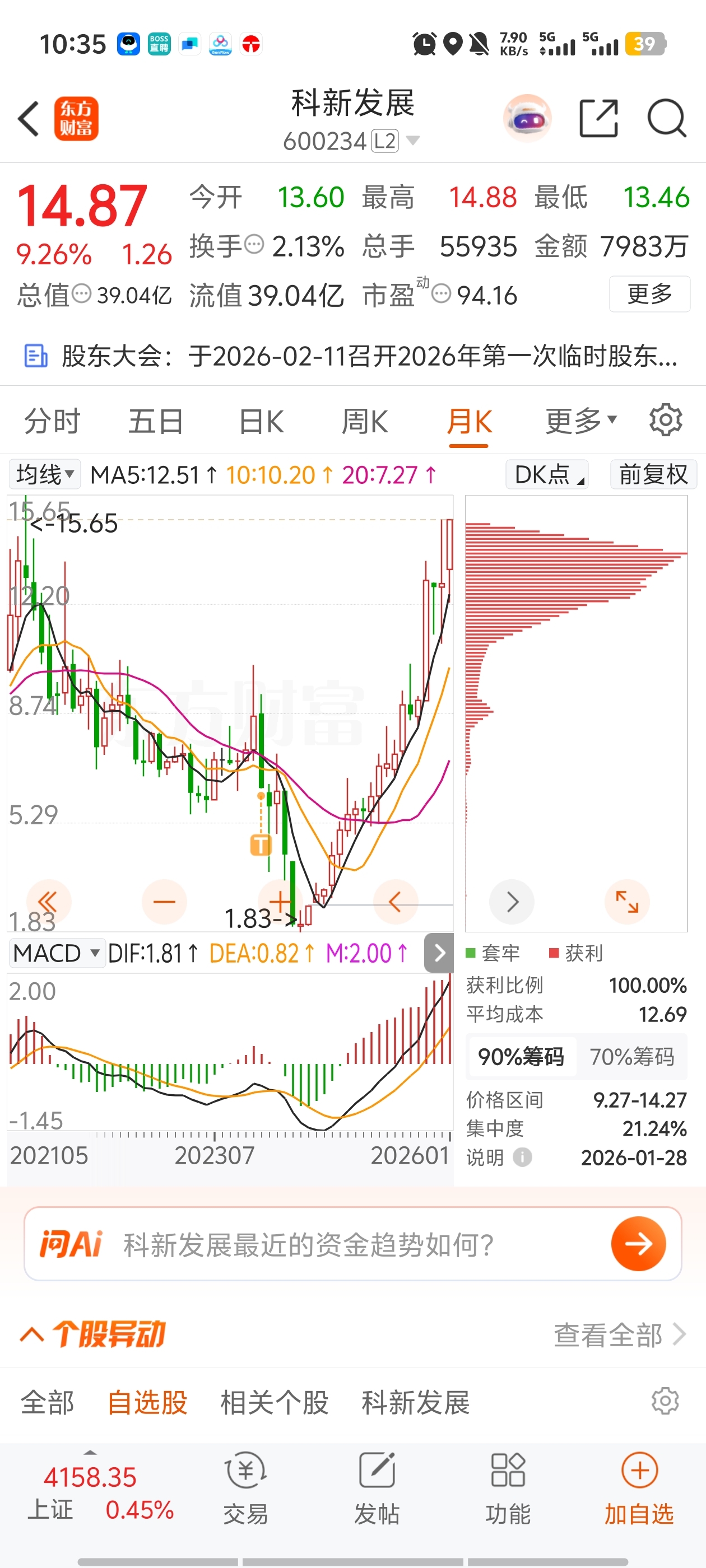 $科新发展(SH600234)$ 这股真牛皮,当初八块玩过,后面变st了一块多我寻思要退市了,现在都15了