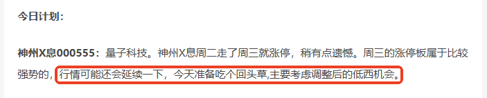 神州X息000555:量子科技。神州X息高开高走,强势涨停,走势符合盘前的预期,也是比较好的表现。开盘入场,收盘涨停。