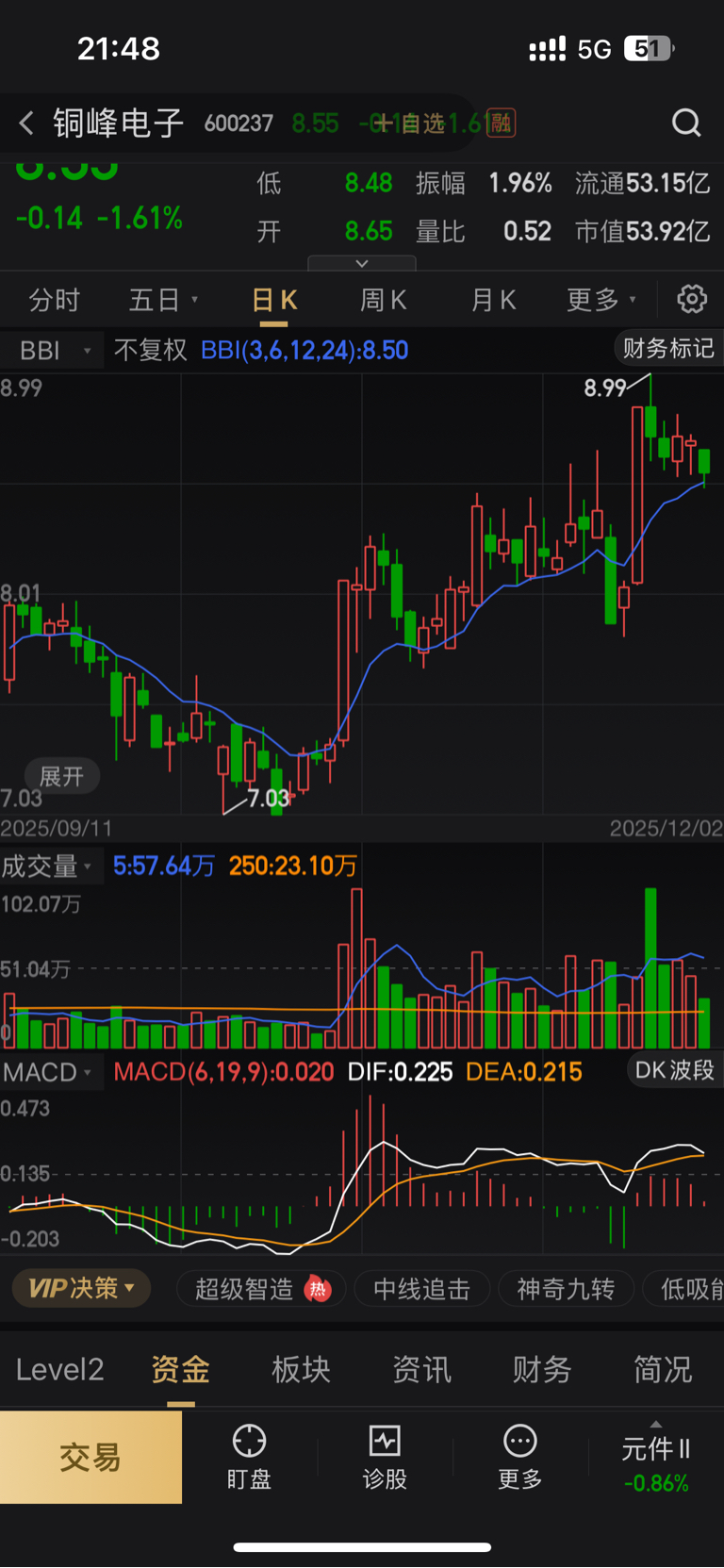 明天低开概率比较大,低开下跌跌幅预测跌幅3个点内然后震荡整理在拉升,洗盘尾声锁仓了,前面涨停放量断板,前面放量就是分歧大,今天缩量回踩多头趋势收回、,如果持续下跌缩量就不好了,,今天符合买阴卖阳的操作,