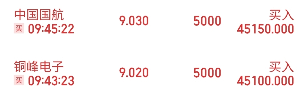 铜峰电子大胆加仓就是了买进国航,已赚钱