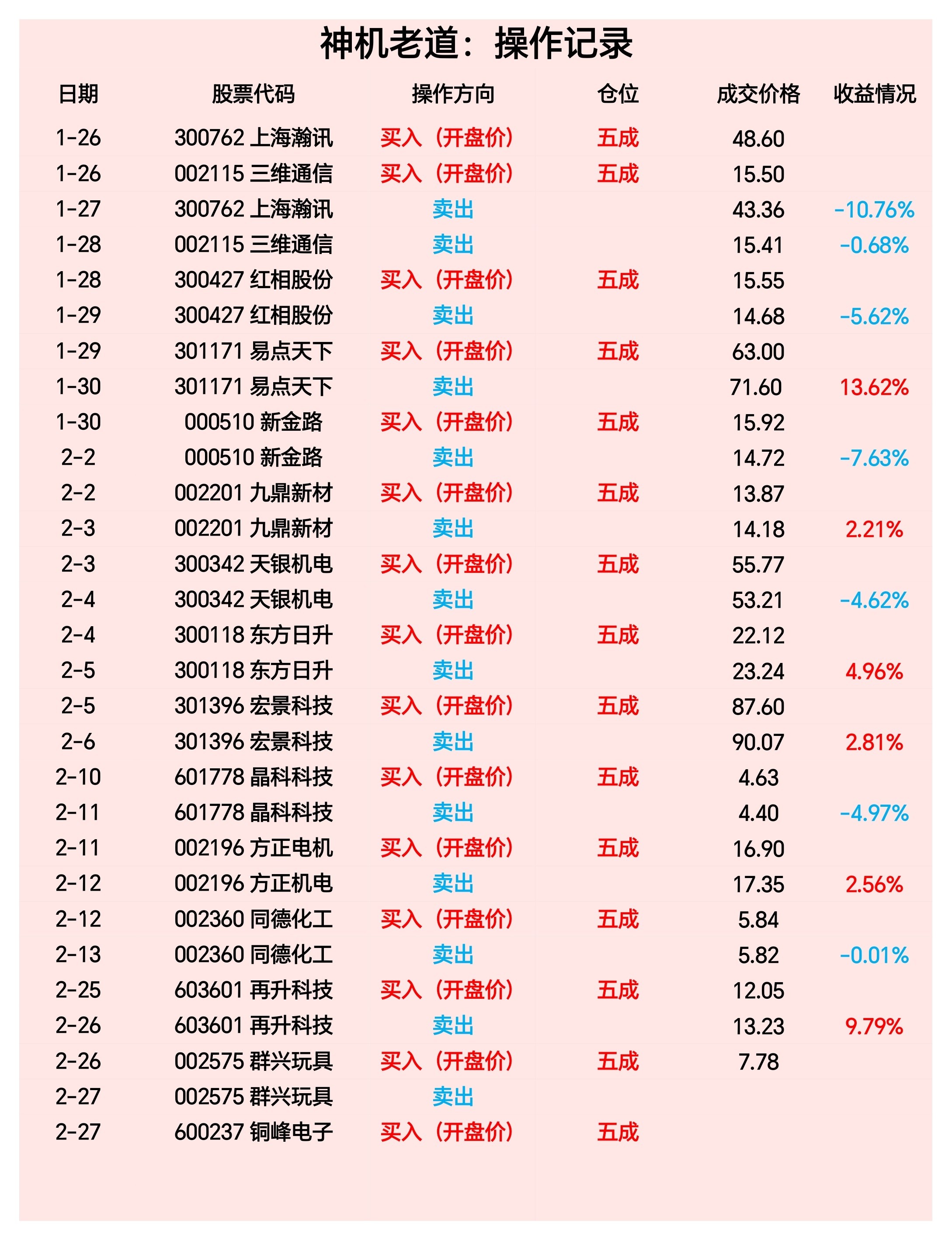 2月27作计划:开盘价买入:600237铜峰电子收盘前卖出:002575群兴