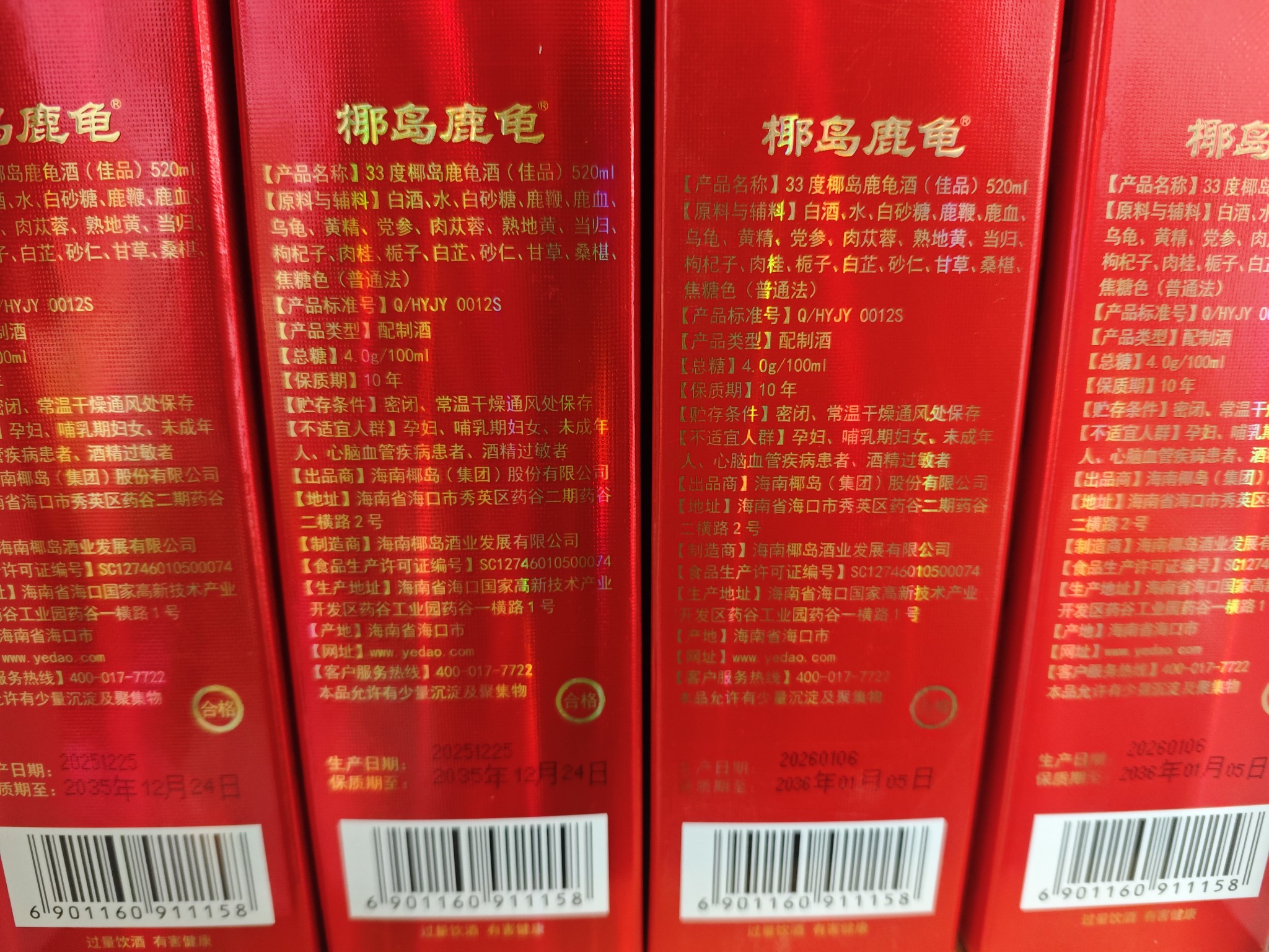 好像是从周末开始,到货的椰岛鹿龟酒出厂日期稳定在2026年1月;椰岛葫芦礼盒如上