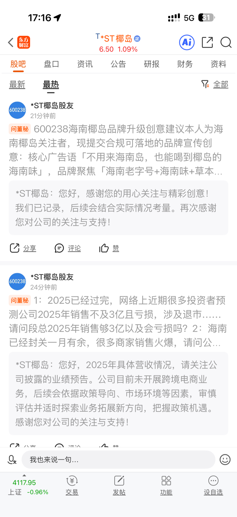 $*ST椰岛(SH600238)$ 董秘还上班就行,今天周五了,周末愉快!