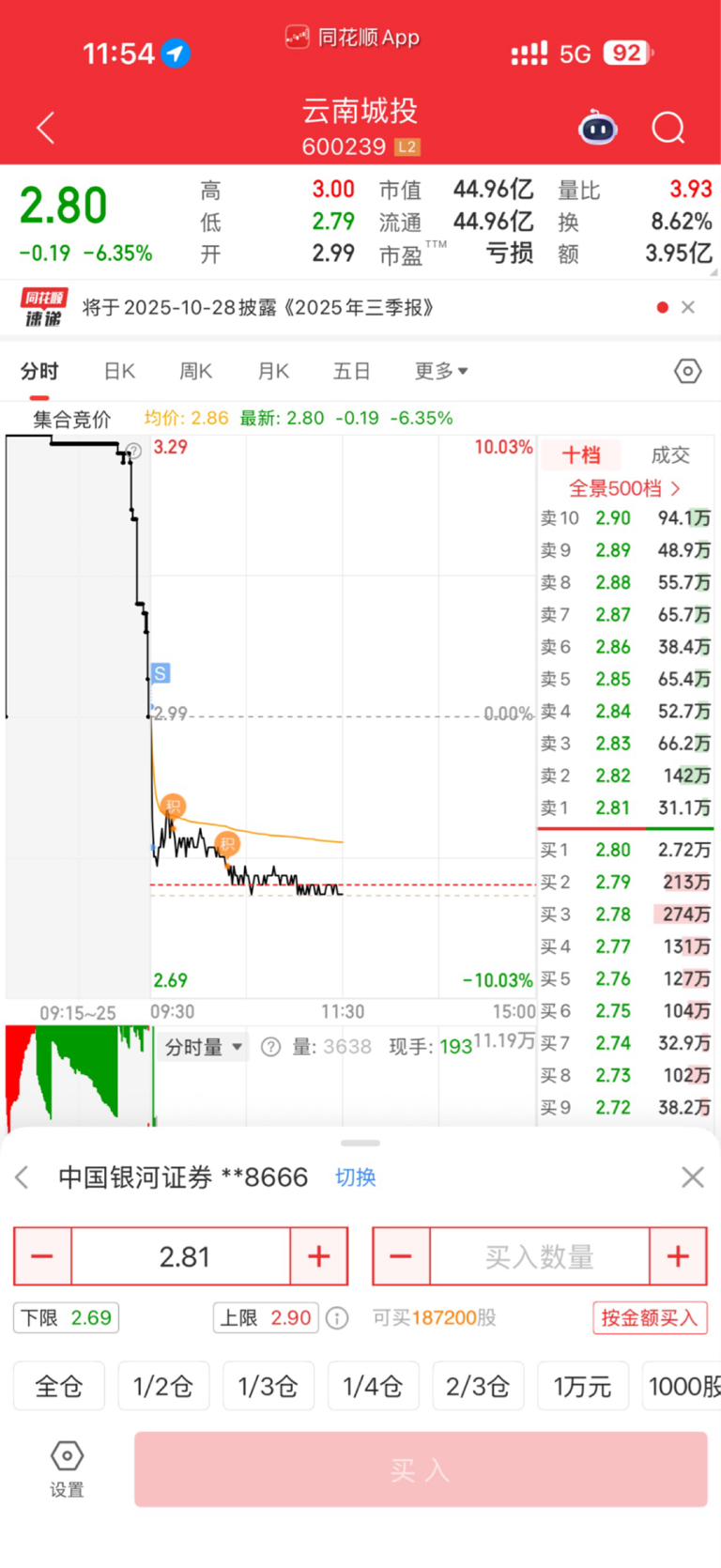 $云南城投(SH600239)$ 竞价不及预期 再见