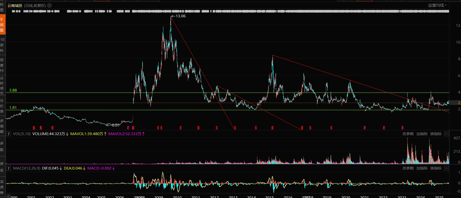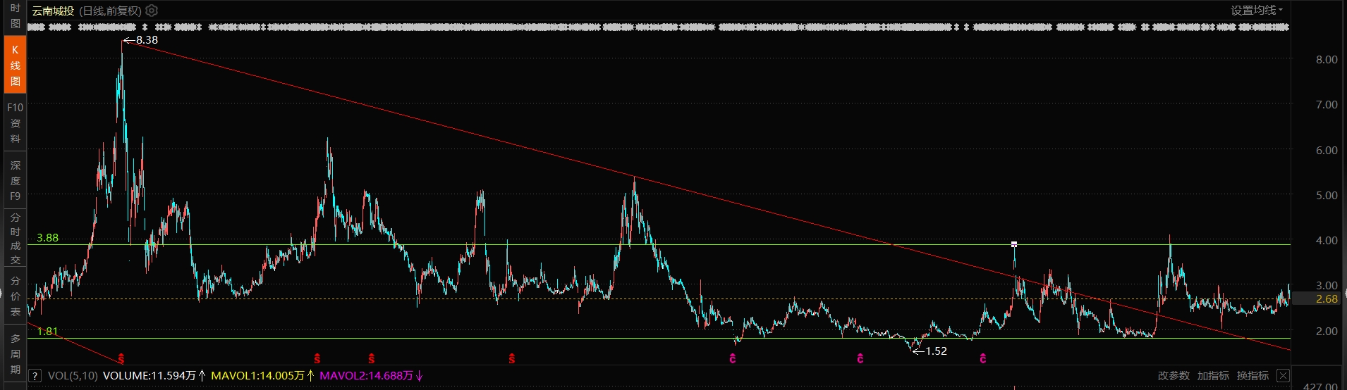 4年箱体震荡,目前在1.81到3.88大箱体震荡,临时放量了,显示有资金关注,观察,是否突破
