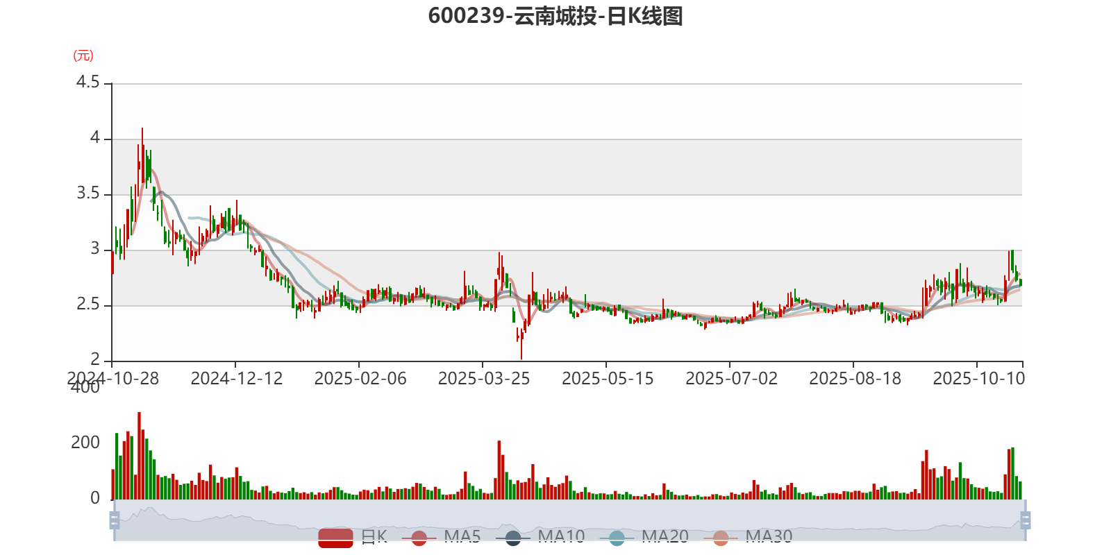 中证智能财讯云南城投(600239)10月28日披露2025年第三季度报告。前三季度公司实现营业总收入13.36亿元,同比下降2.97%;归母净利润亏损3522.18万元,上年同期盈利1796.91万元;扣非净利润亏损1.14亿元,上年同期亏损5619.69万元;经营活动产生的现金流量净额为6.74亿元,上年同期为-2.49亿元;报告期内,云南城投基本每股收益为-0.02元,加权平均净资产收益率为-2.71%。