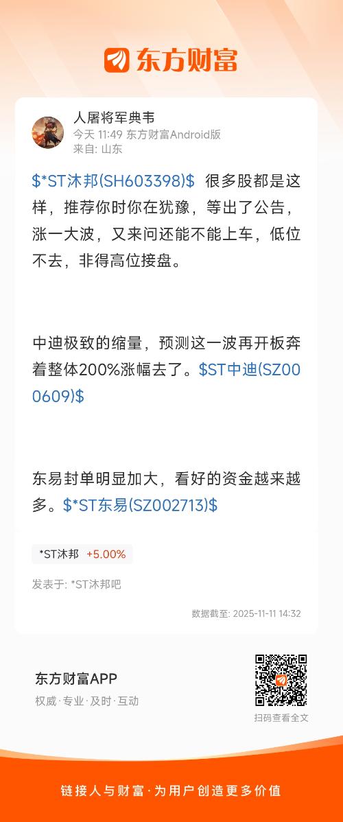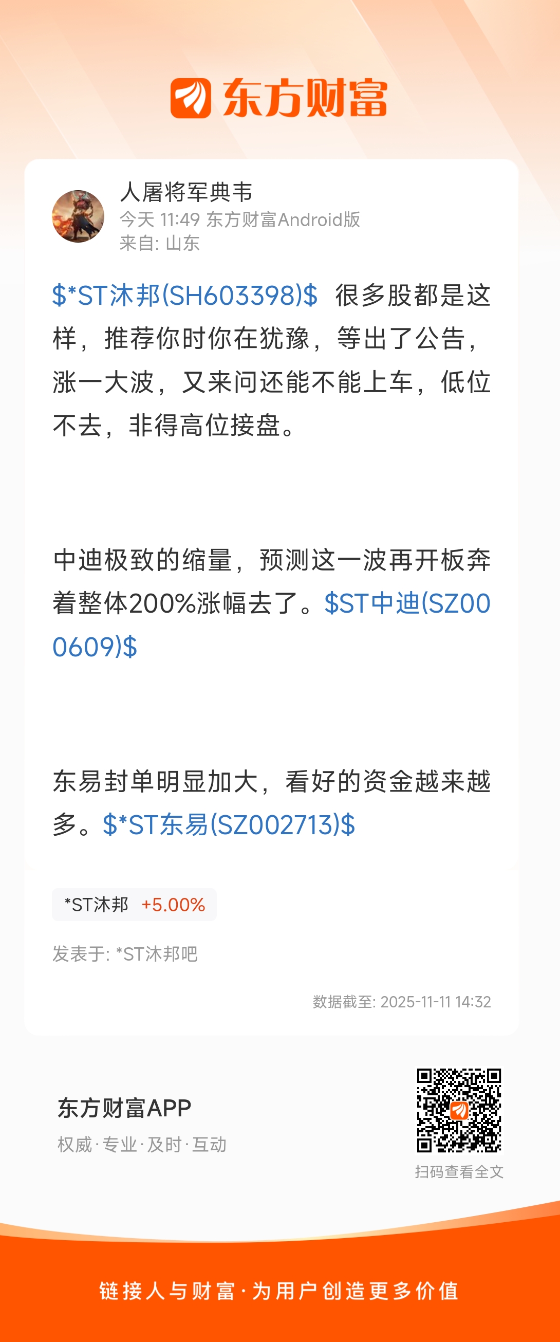 $*ST沐邦(SH603398)$ 很多股都是这样,推荐你时你在犹豫,等出了公告,涨一大波,又来问还能不能上车,低位不去,非得高位接盘。