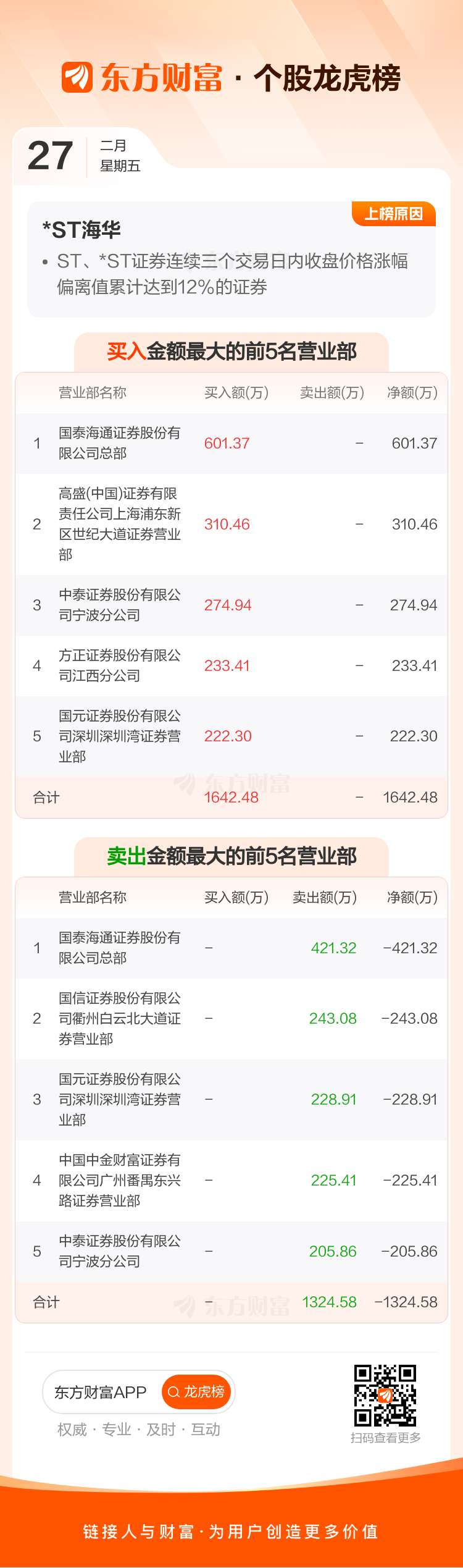交易所2026年2月27日公布的交易公开信息显示,*ST海华因成为ST、*ST证券连续三个交易日内收盘价格涨幅偏离值累计达到12%的证券上榜。*ST海华当日收报3.78元,涨跌幅5.00%,换手率1.05%,成交额1726.20万。异常期间2月25日至2月27日,期间涨幅15.60%,累计偏离值14.49%,区间成交额8135.29万。