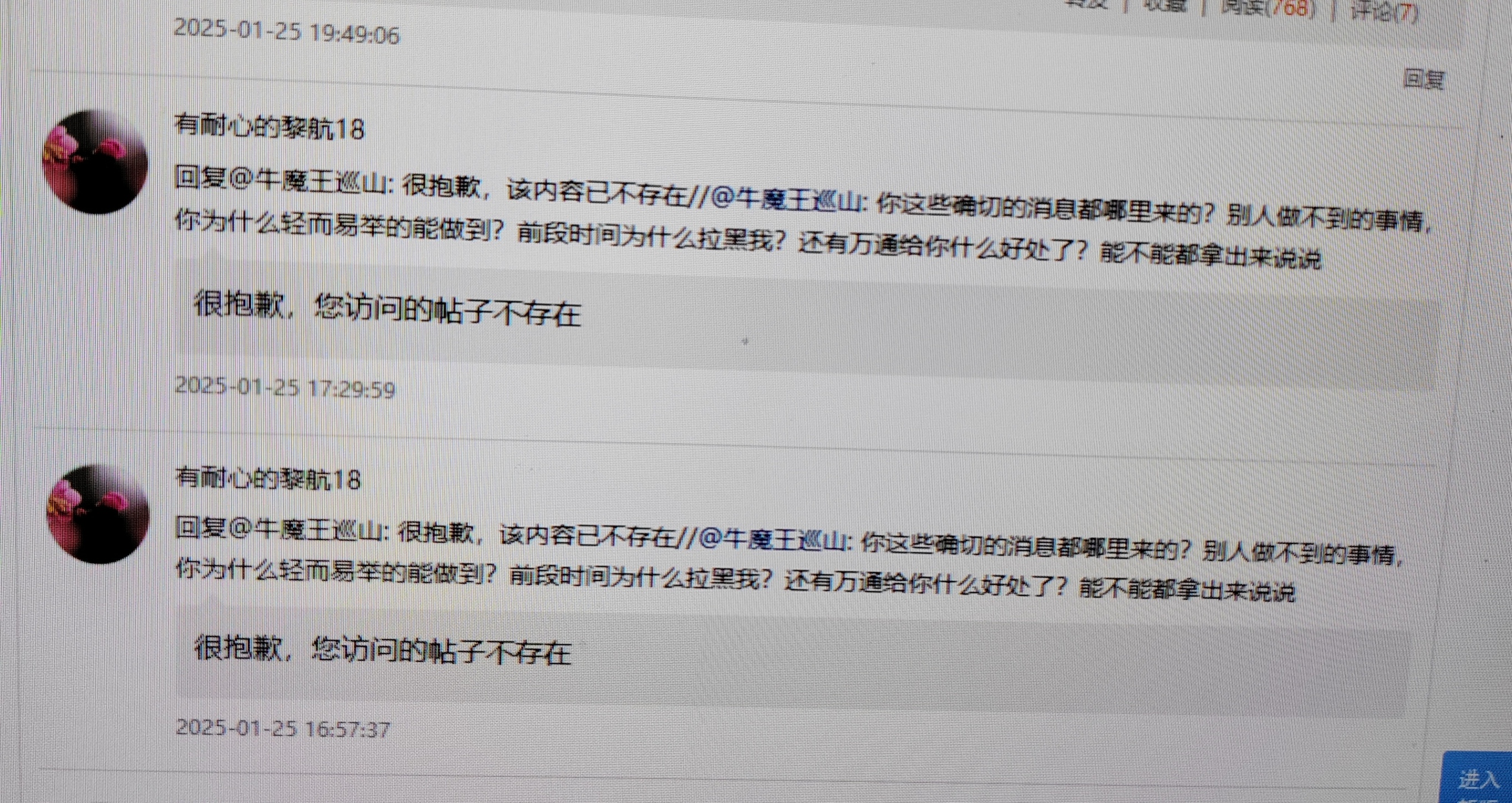 有耐心的黎航18@这个人就没法律能管得了它吗?发点东西,一会又删除,害怕啥?种种迹象表明,你就是忽悠大家不要放弃万通,哪里有举报管用的,告诉我,我来举报它