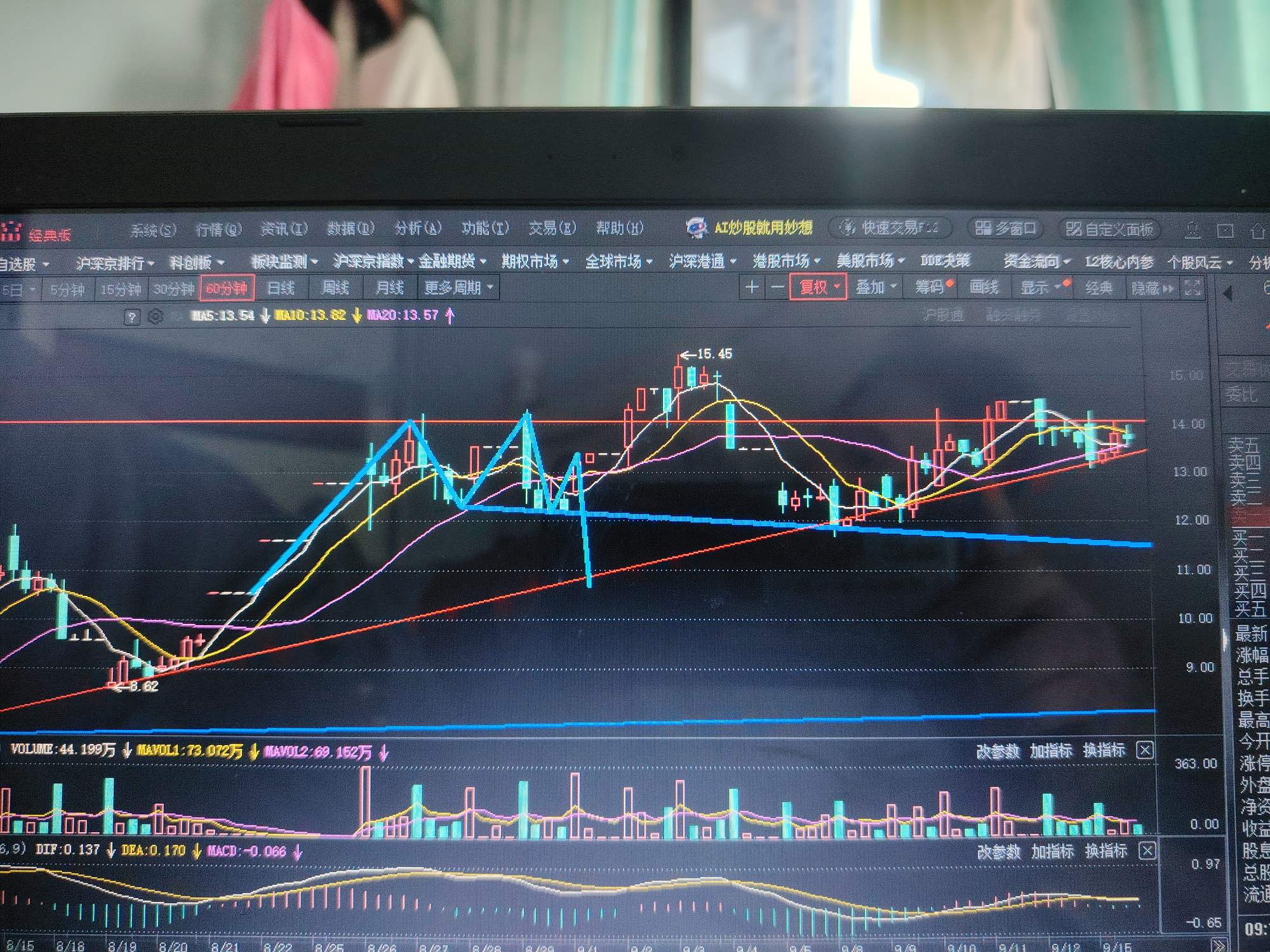 如果日线级别是走五浪,那现在60分钟级别头肩顶形态就赌它颈线位有支撑,应该刚好是日线级别四浪调整,第一浪的高点12块附近。强势一点的话可能四浪调整只是浅浅的区间震荡,然后直接上行。