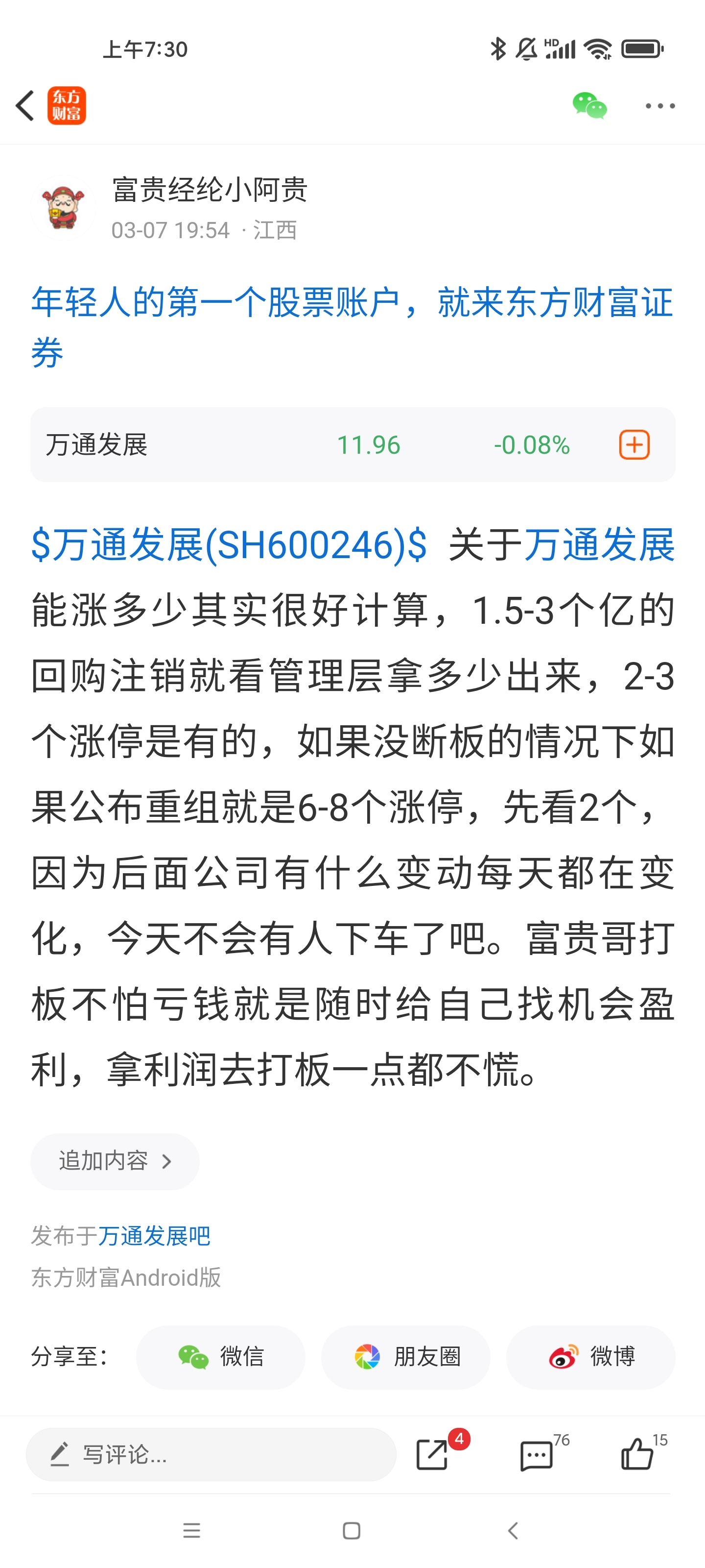 $万通发展(SH600246)$ 这里看到有人买我都无语,肯定是重组前买票,重组完了人家货也出完了,3月份天天呼吁买票没人买而且当时都说了大概率就是2+6的走势,结果来看有效板刚好8个,买票要提前买当大家都知道消息了就是卖