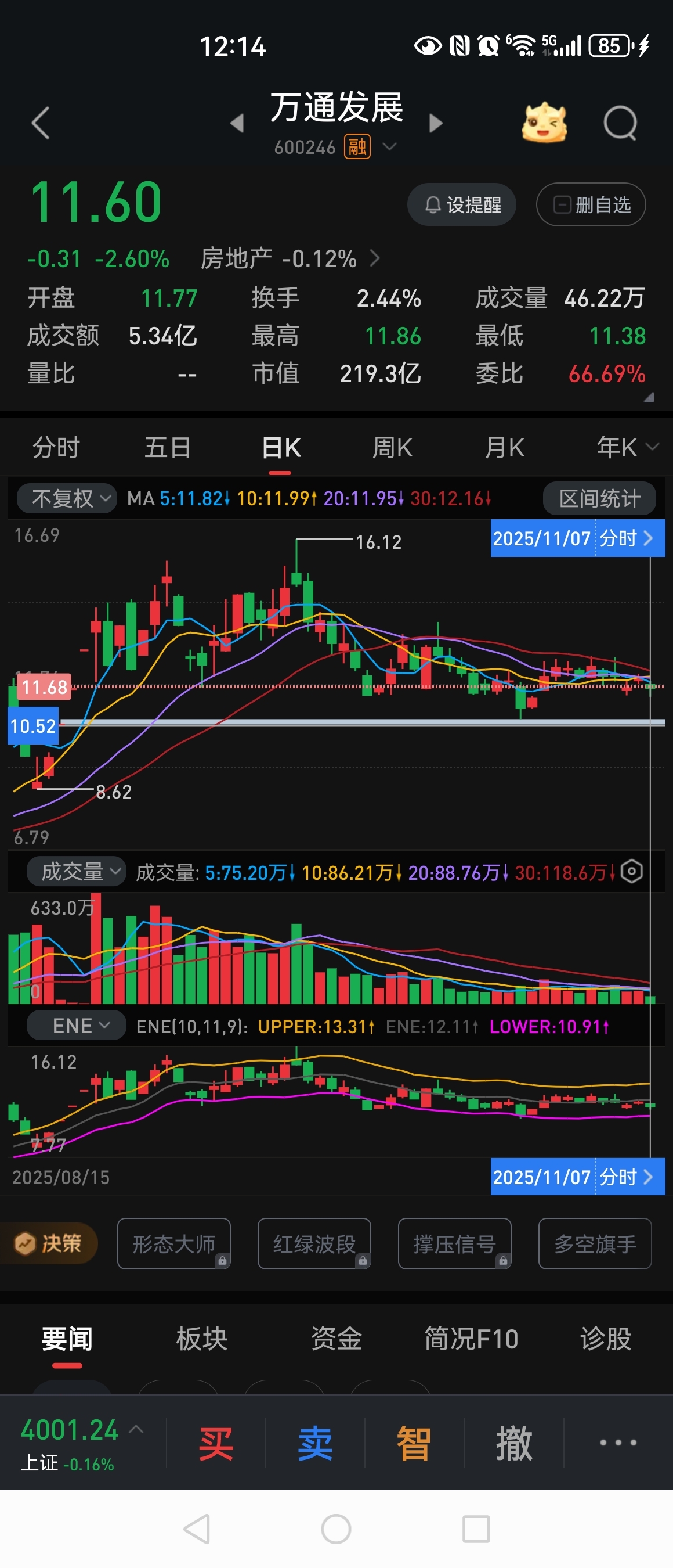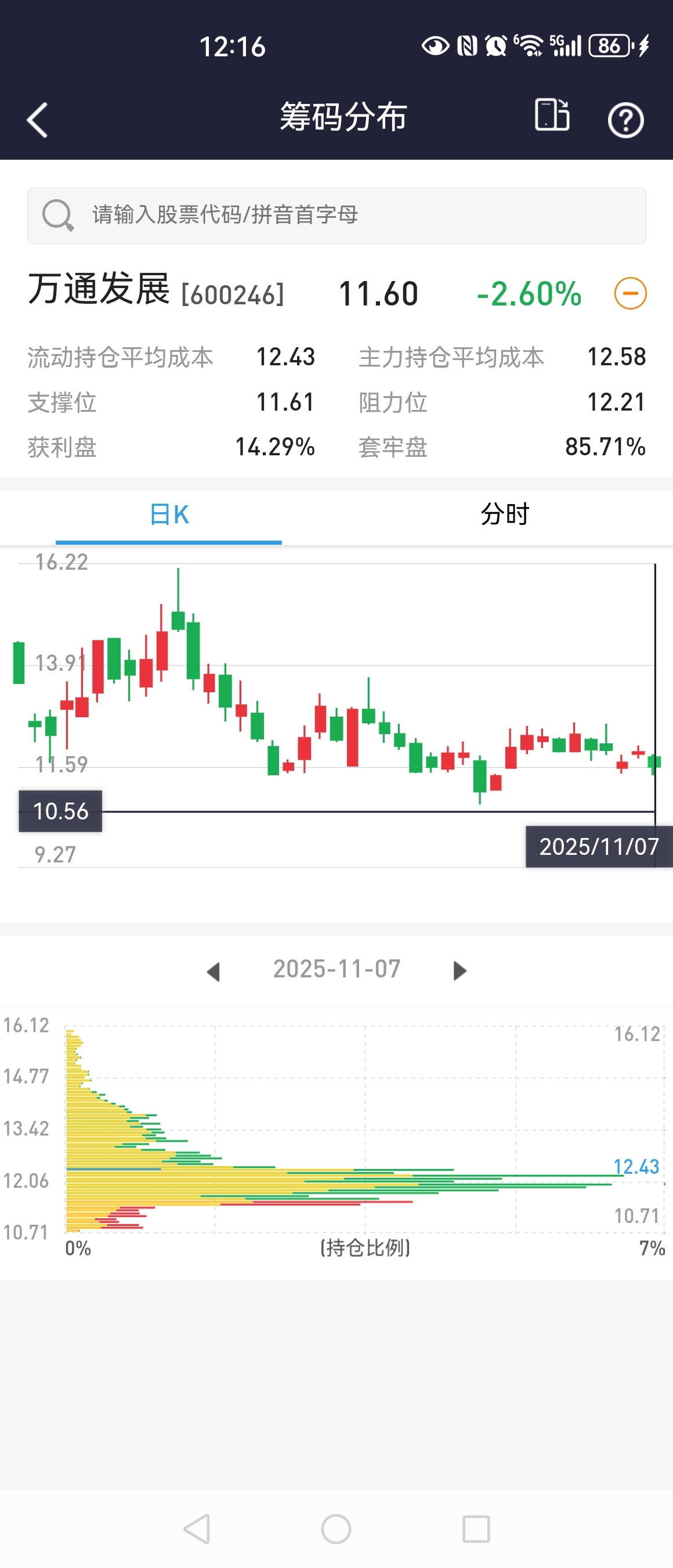 $万通发展(SH600246)$ 今天上午尝试砸破11.40元支撑位,之后很快反弹收复,结合这几天的竞价以及走势,主力没有放弃这只股票,也不是纯意义上的出货,主力仍然在吸带血的筹码。划分为几个价格区间,在清洗浮筹。10.55元的缺口儿依然可见,筹码峰整体依然在中上部。套牢盘居多,盈利盘很少,近期走势估计会震荡幅度比较大。