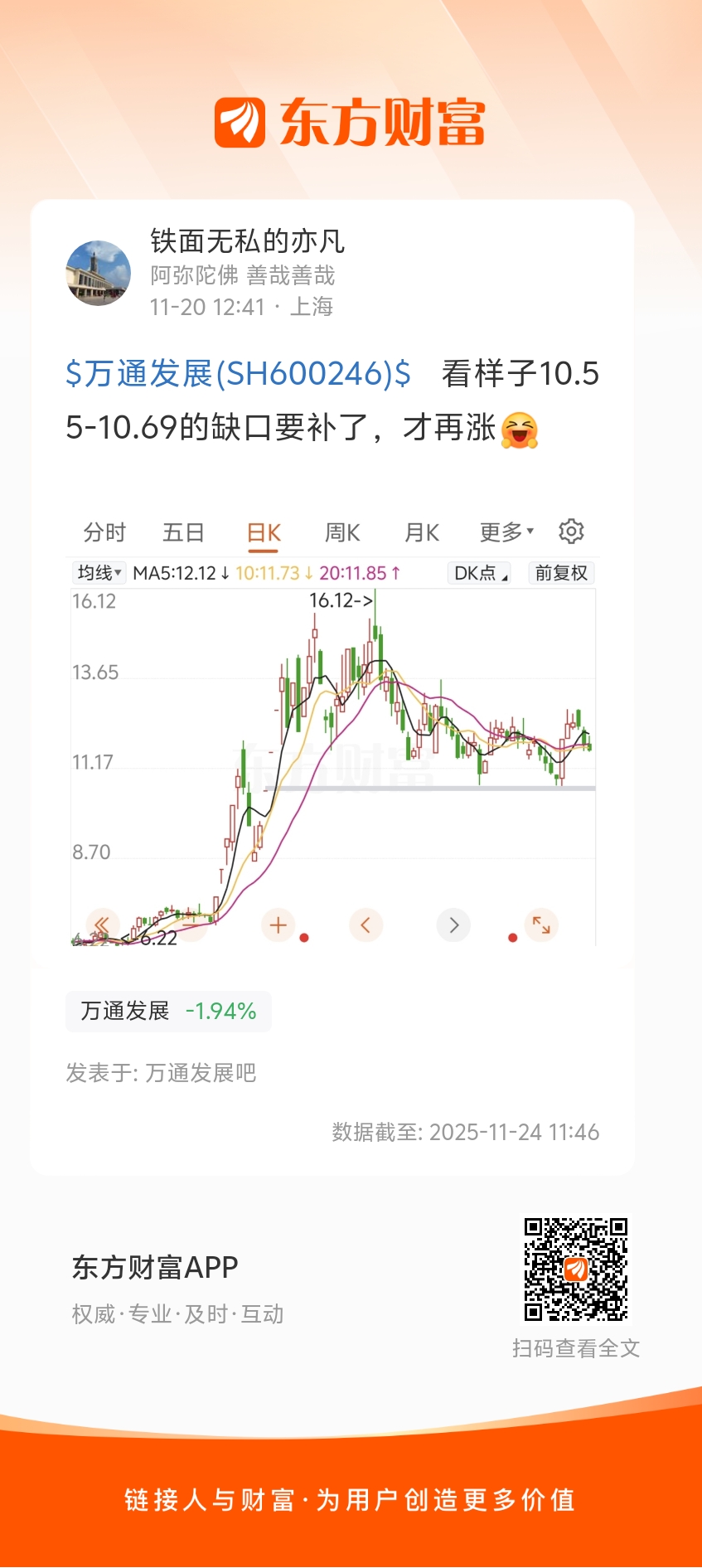 $万通发展(SH600246)$   看样子10.55-10.69的缺口要补了,才再涨