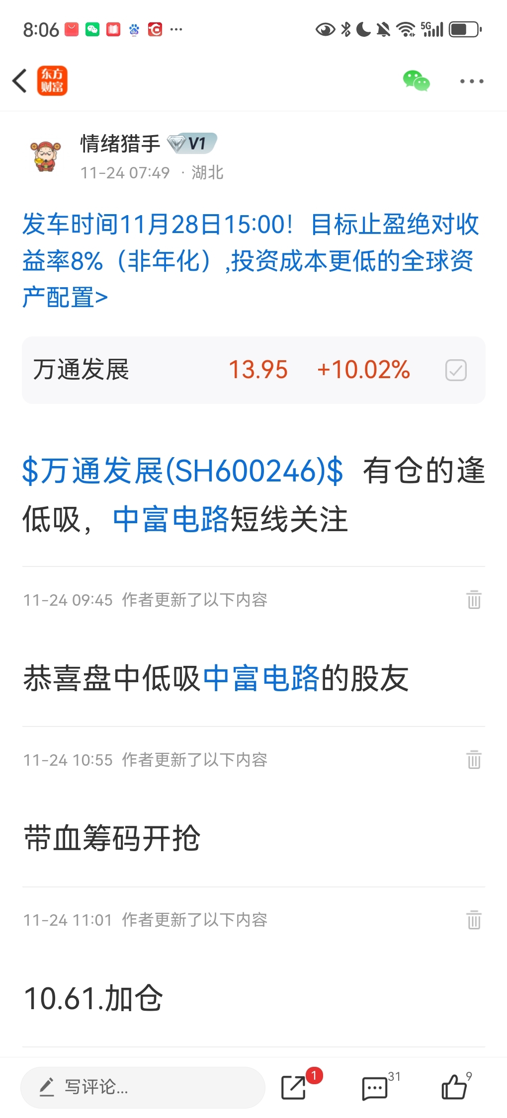 $万通发展(SH600246)$ 这个市场就是这样的,中富电路短线20%利润,高点让跑,万通10.8以下提示只有买点,没有卖点,万通发展10.61提示买入,今天尾盘炸板出了5层仓位,明天冲高我在卖一半,成本估计不到2元,你想怎么跌就怎么跌,无所谓了
