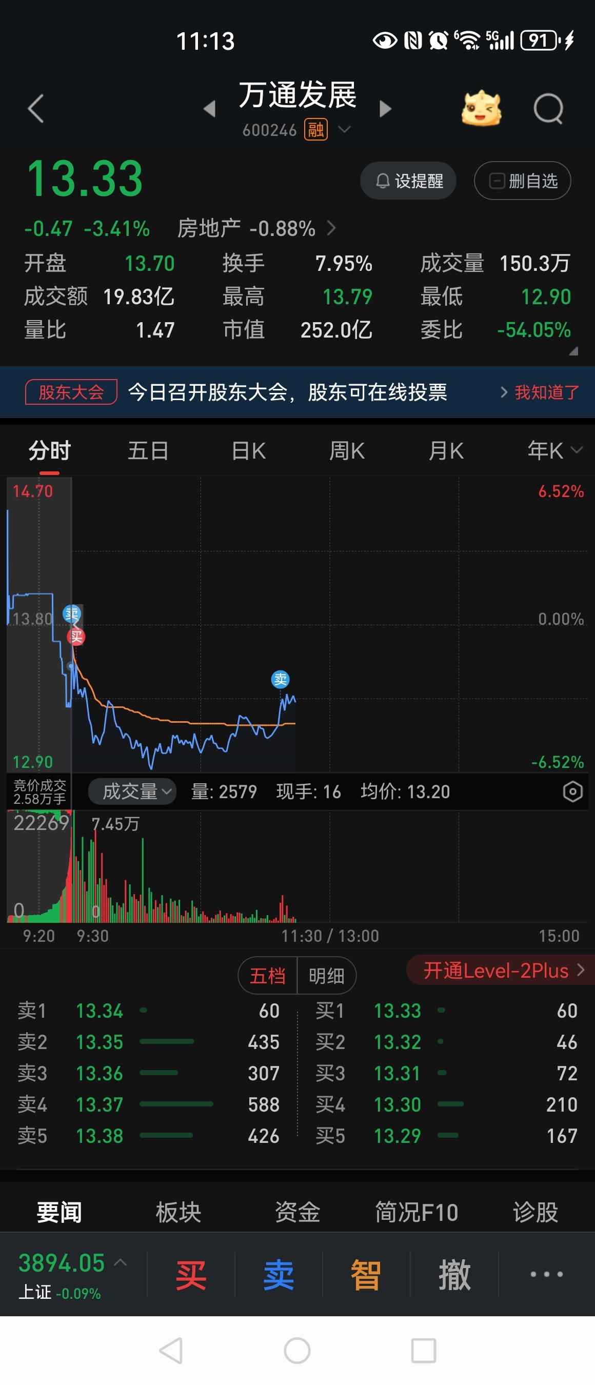 $万通发展(SH600246)$ 本来早晨竞价阶段挂了个13.75出了,结果没管住手,第一波才T了几毛钱。挂13.35又成交了,又挂低了