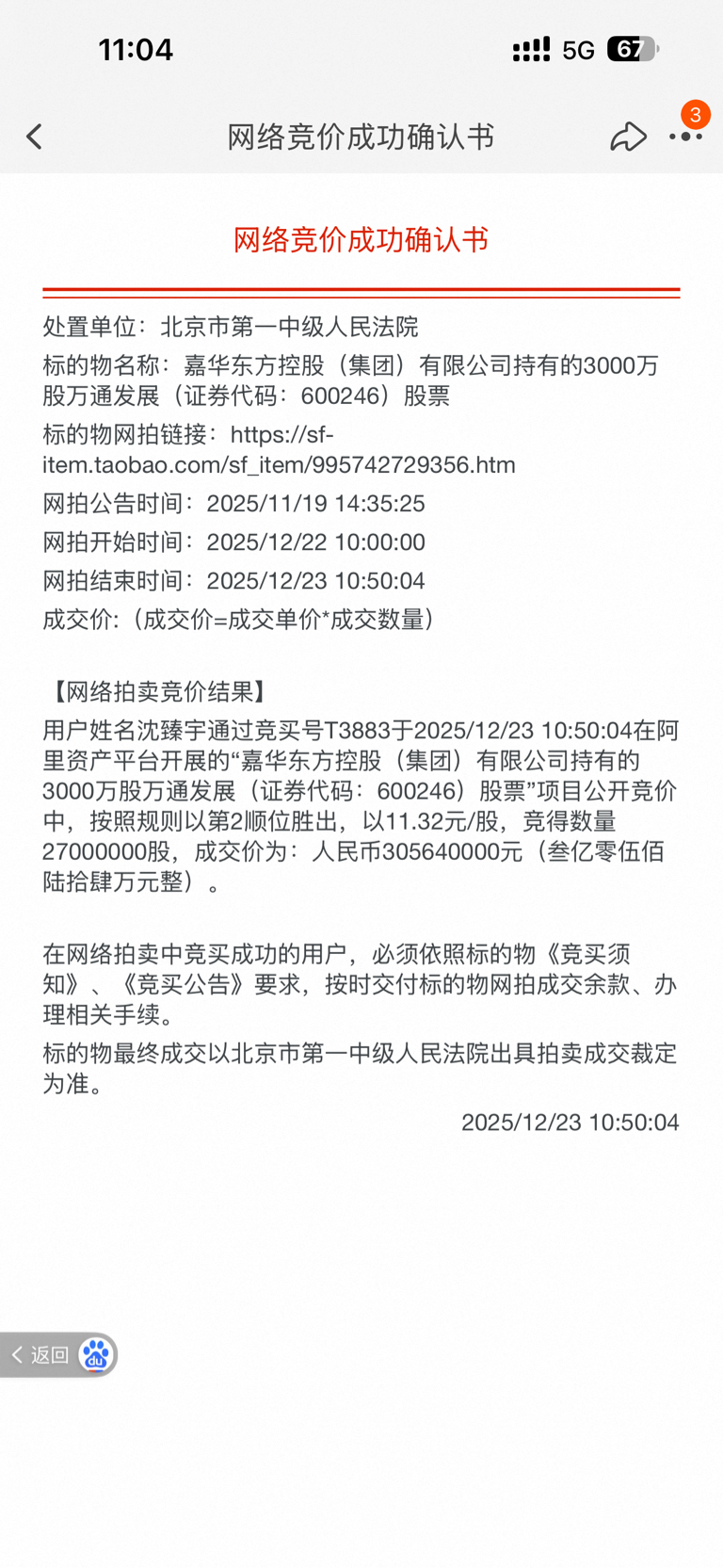 $万通发展(SH600246)$  恭喜两位大佬竞拍成功