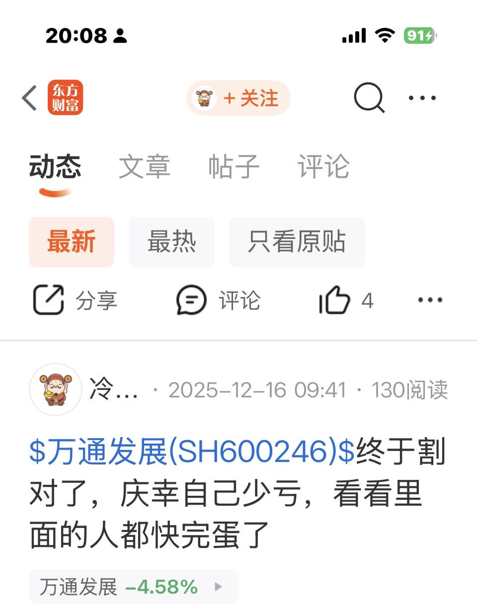 $万通发展(SH600246)$ 冷吴祥你越是发这么多帖贬低万通就越说明你心中的痛苦!周五卖掉就这么在乎它!这么看好它!想着万通下来再接回来,这么纠结的心态也是第一次遇到,真的很担心你的身体!别被万通给逼疯了。不值得!