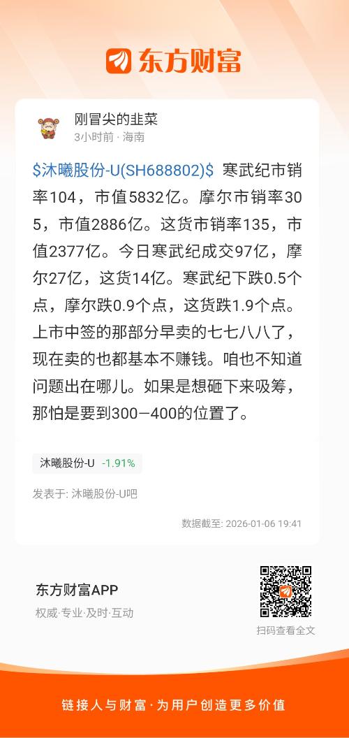 $沐曦股份-U(SH688802)$ 寒武纪市销率104,市值5832亿。摩尔市销率305,市值2886亿。这货市销率135,市值2377亿。今日寒武纪成交97亿,摩尔27亿,这货14亿。寒武纪下跌0.5个点,摩尔跌0.9个点,这货跌1.9个点。上市中签的那部分早卖的七七八八了,现在卖的也都基本不赚钱。咱也不知道问题出在哪儿。如果是想砸下来吸筹,那怕是要到300—400的位置了。