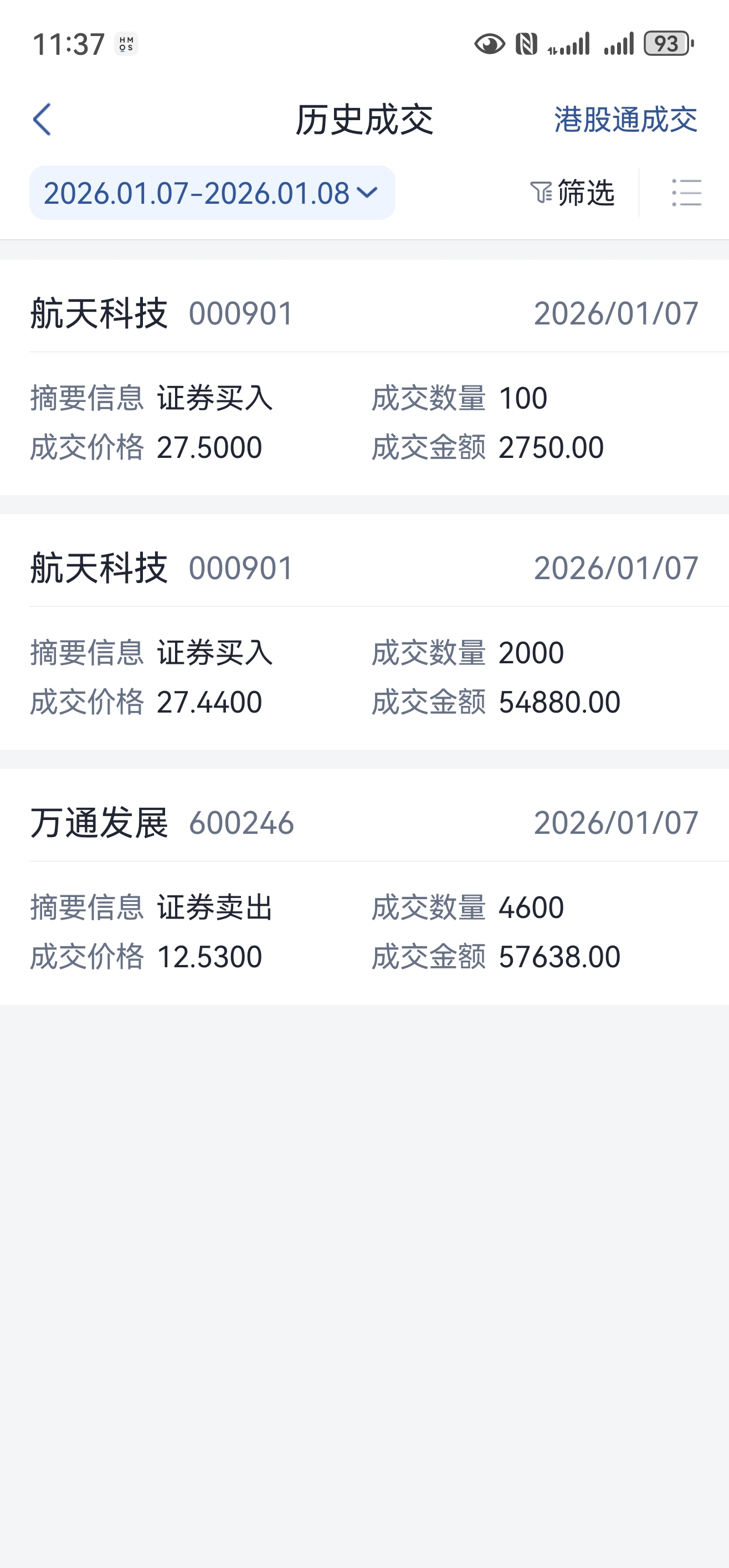 $万通发展(SH600246)$ 昨天让饿庄搞坏心态了,上午2个点的涨幅都站不住,尾盘卖了这垃圾,换航天科技,今天就吃一个涨停。前天赚了4个点卖掉的航天智造也不错,连涨3天。前天尾盘买的万通到昨天尾盘卖,不亏不赚浪费一天时间