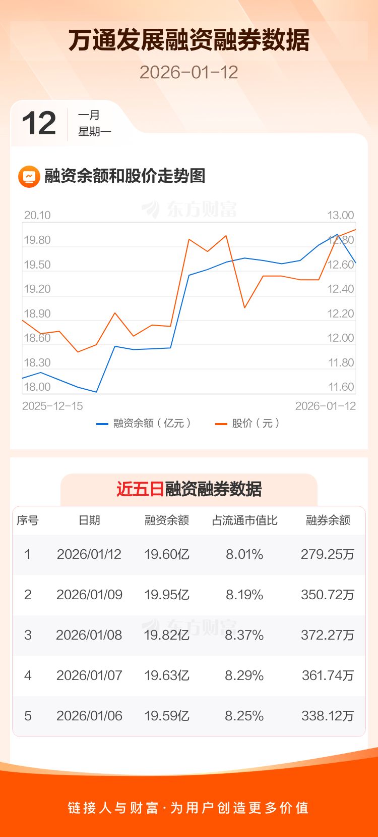 交易所最新数据显示,万通发展于2026年1月12日获融资买入8656.28万元,融资偿还1.21亿元,当日融资净偿还3449万元。目前,该股融资余额19.60亿,占流通市值比例为8.01%。