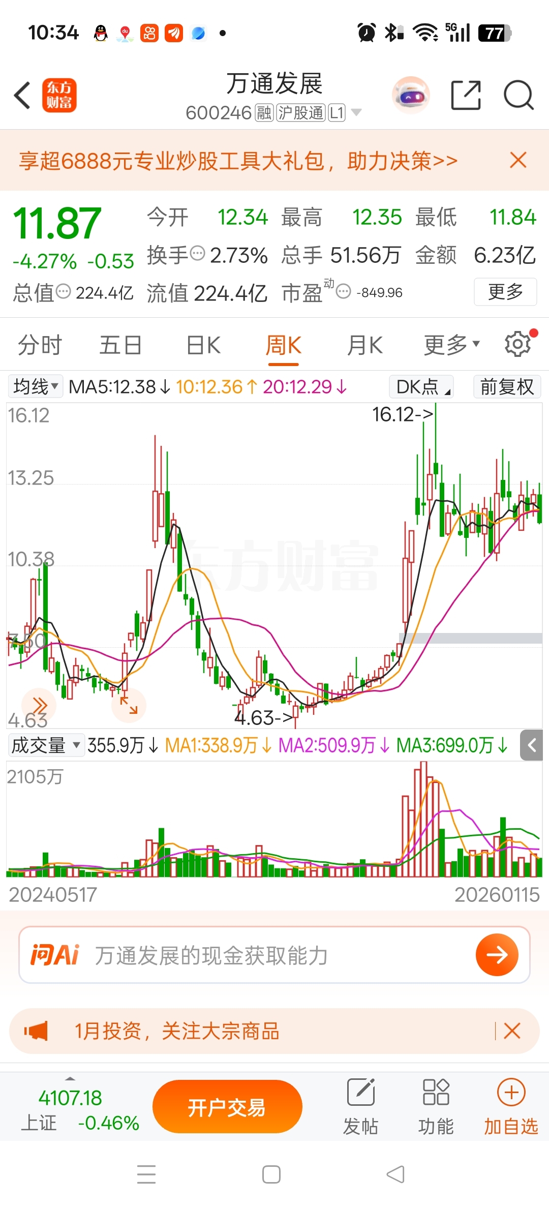 $万通发展(SH600246)$ 周五收盘前收不回12.30就跌破八个月的中线上涨趋势线了。明天收盘前收不回12.3。各位就散了吧。